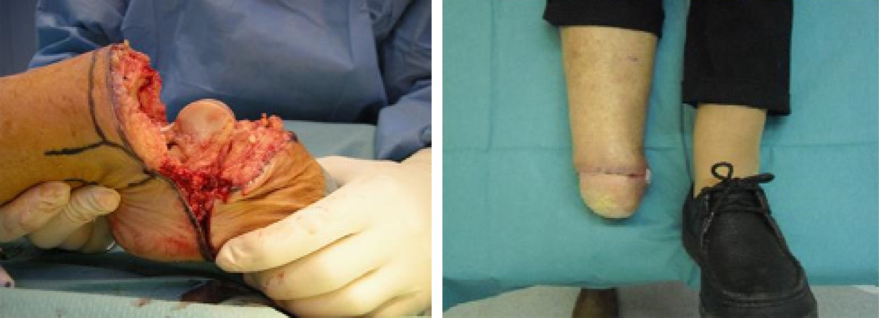 At this stage of the disease and after ruling out metastatic lesions, the only possible treatment was a radical amputation with wide margins, whose level will be directly influenced by the condition of the skin. Due to the patient's age and with the goal of giving the patient a guaranteed solution with only one surgery, it was decided that a Syme (Figure 5) amputation would be the best surgical method of treatment. The pathological study of the surgically amputated section confirms a diagnosis of keratinizing squamous carcinoma and the infiltration of ulcerative lesions on the dorsal aspect of the foot as well as on the plantar aspect of the foot. No bone invasion was observed. Surgical margins were free of tumor.