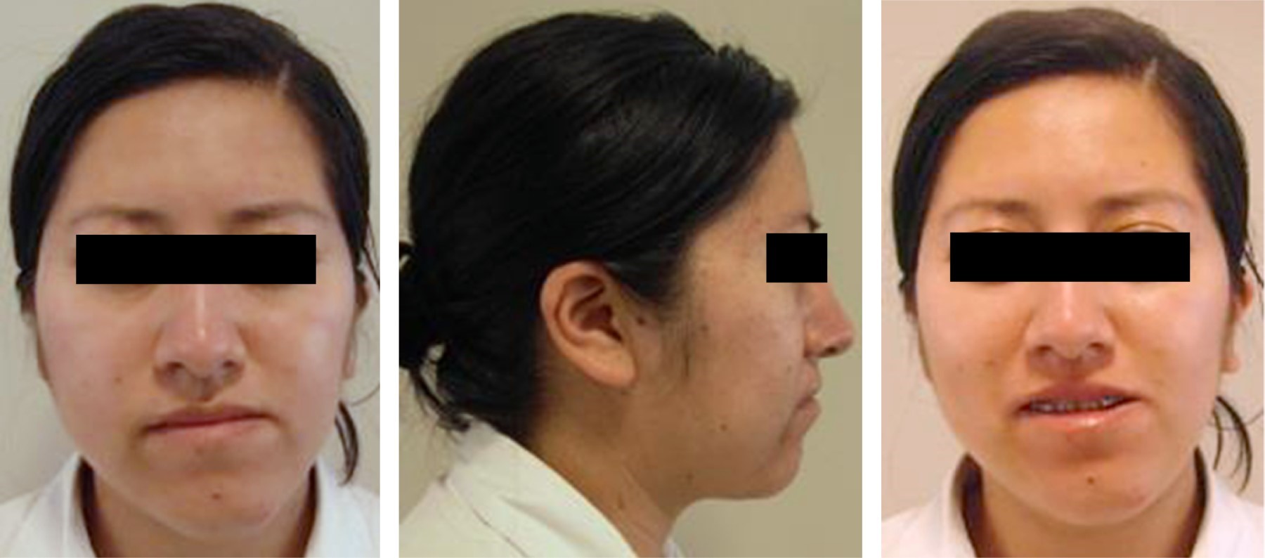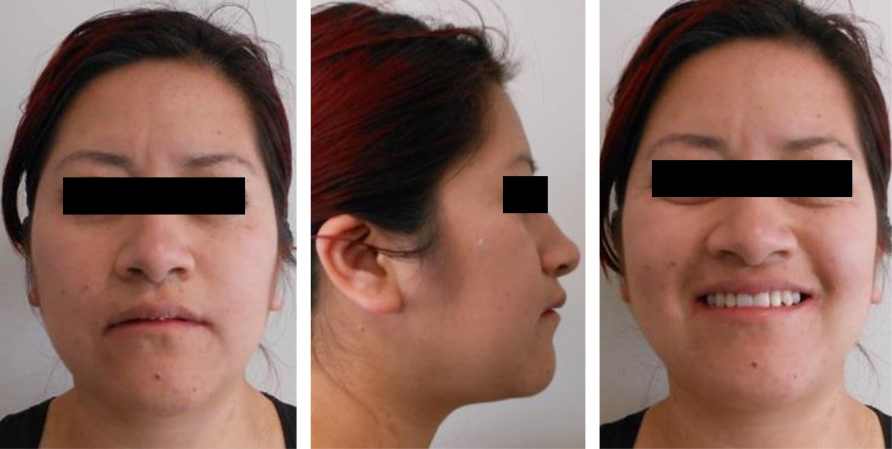 Profile analysis: patient presented a slightly convex profile, gibbous nose, inferior prokelia, obtuse nasolabial angle (open) (Figure 1).