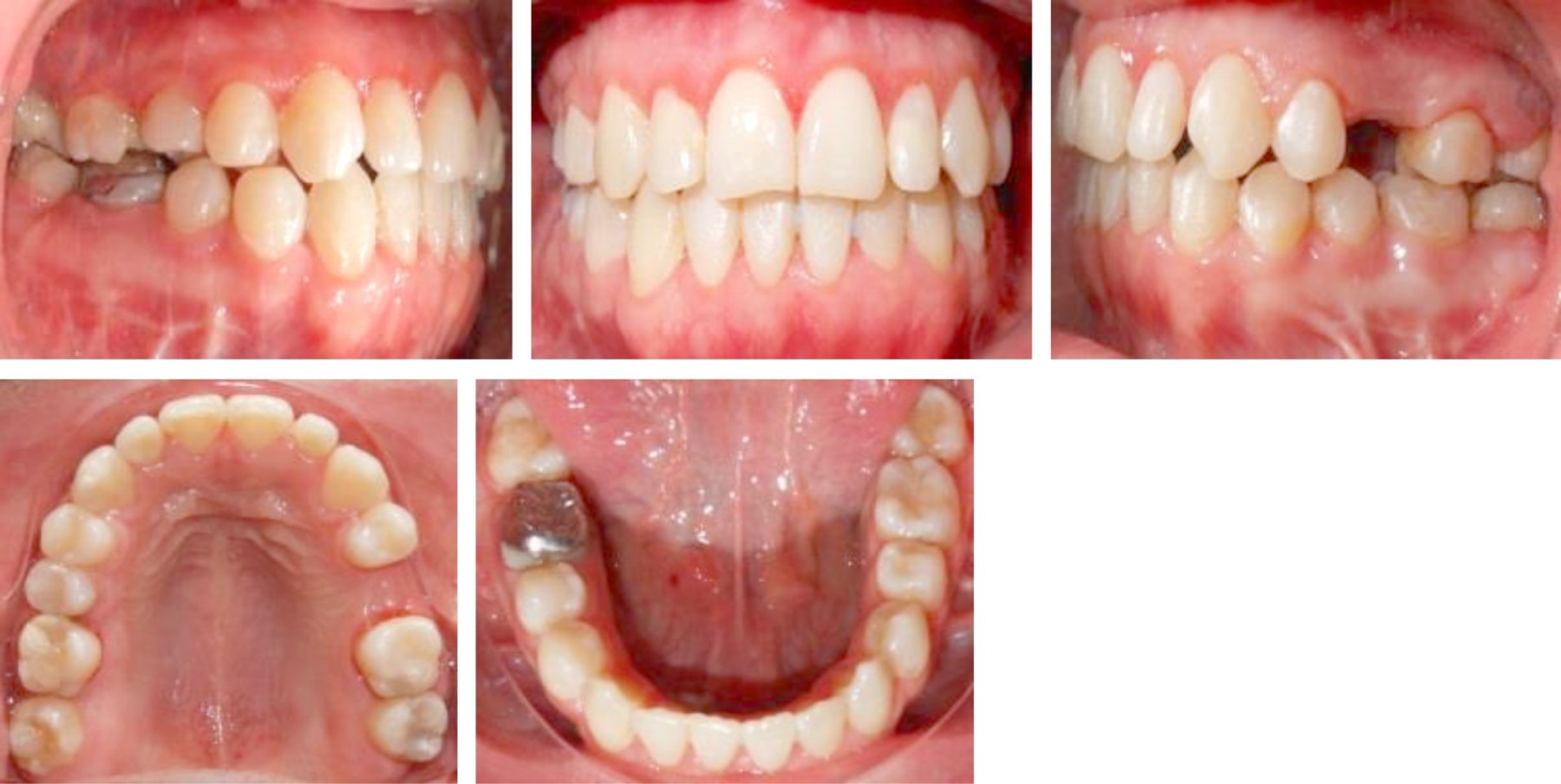 Intraoral characteristics: absence of dental organs 25 and 47, non-coincident dental midlines, square arches, and bilateral class III molar and canine relationship, with an anterior crossbite. Vertical overbite of -3 mm and horizontal overbite of -6 mm (Figure 2).