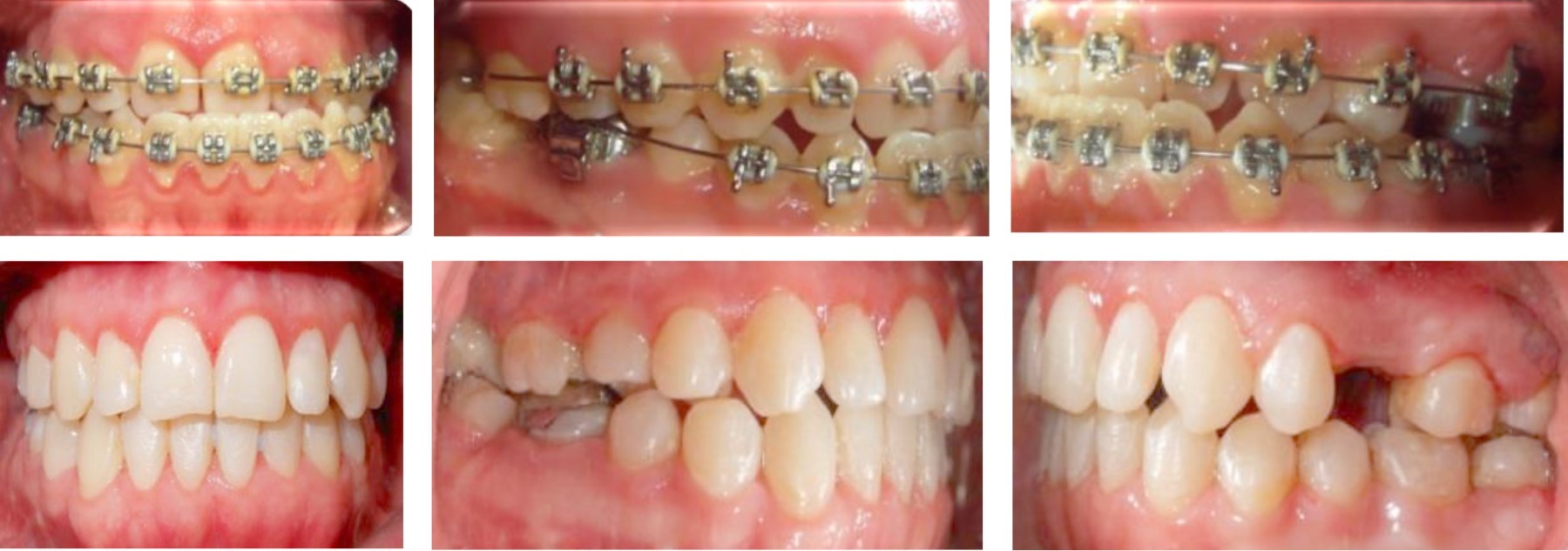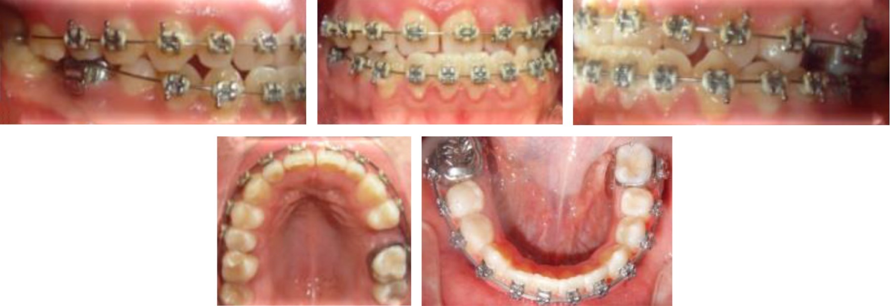 Treatment progressAfter the extraction of the third molars, we proceeded to the placement of fixed appliance Roth self-ligating slot 0.022" to begin phase I, starting with NiTi 0.014" archwires in both arches to begin with the alignment and leveling (Figure 6).