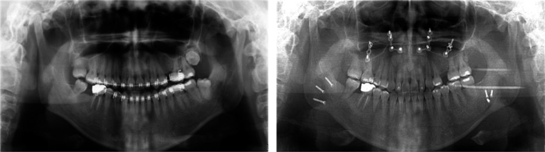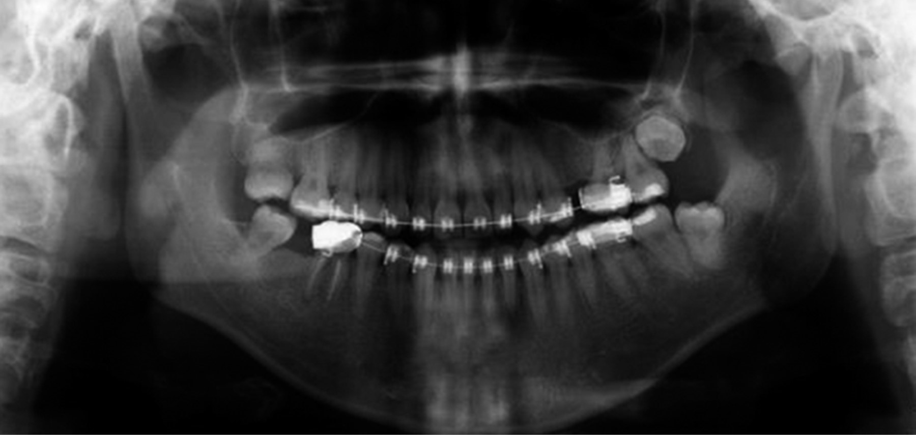 Orthopantomography was taken to verify radicular parallelism, and control of the osteosynthesis material (Figure 10). The patient continued using elastics to correct muscular patterns of occlusal settlement. Consultation was made with the Department of Periodontics, DEPeI, UNAM, for the future placement of dental implants, where they told us to have an adequate space of 7 mm for the upper left premolar (Figure 11).