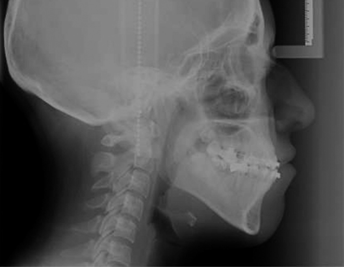 The treatment was completed in 23 months, in which the profile was improved, the gingival smile was eliminated, providing facial harmony (Figure 12). The crossbite was eliminated leaving a more stable case, providing an adequate dental harmony, class I canine, and bilateral molar. It was possible to center the dental midlines, improve the shape of the arches, and vertical and horizontal overbite (Figure 13). The dental inclinations were improved and skeletal class I was achieved (Figure 14). A circumferential retainer was placed to improve the occlusal set. After two months, the occlusal adjustment was performed (Figure 15). The changes obtained can be observed facially (Figure 16), occlusally (Figure 17), and radiographically (Figures 18 and 19).