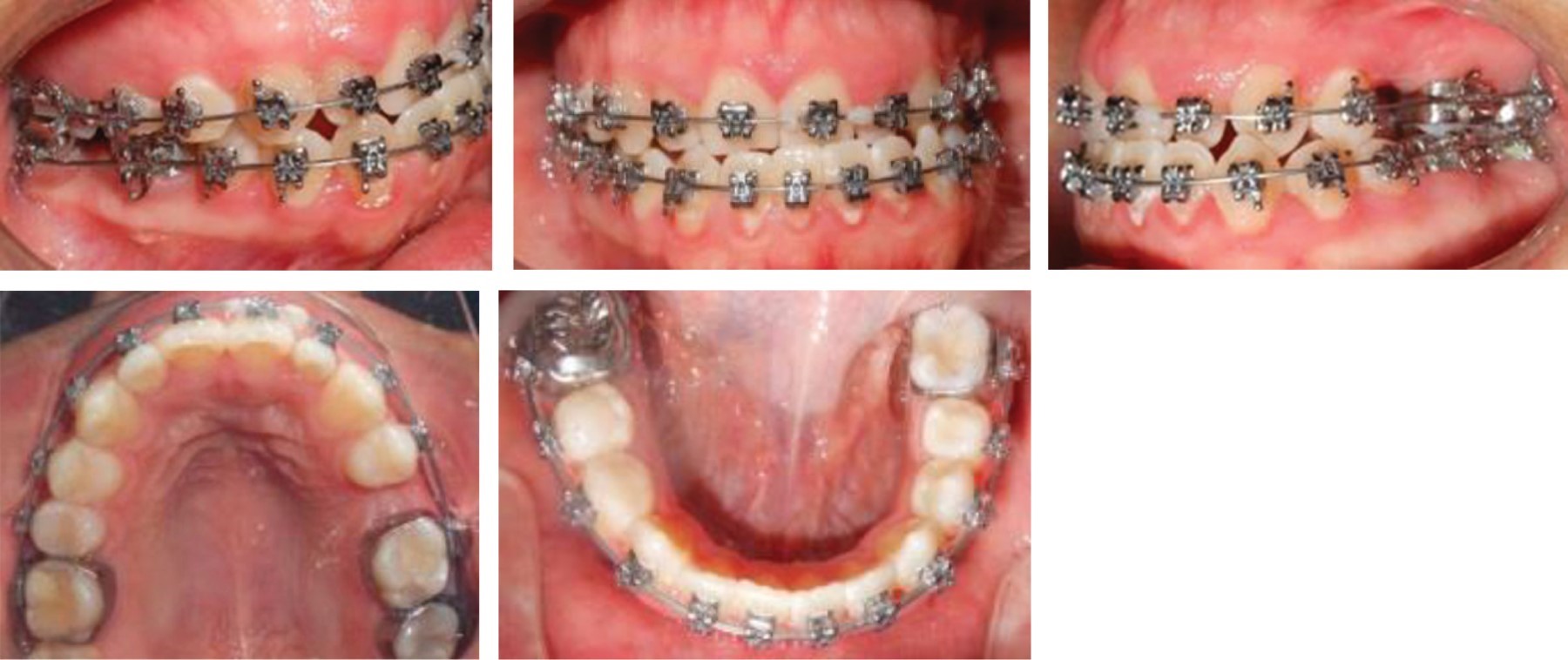 The treatment continued in the first phase, aligning and leveling, using 0.016" NiTi round archwires, and then begin to express torsional movements with 0.016" × 0.022" NiTi rectangular archwires, and 0.017" × 0.025" and 0.019" × 0.025" NiTi, then the same calibers were used but with a different alloy (stainless steel) (Figure 7).