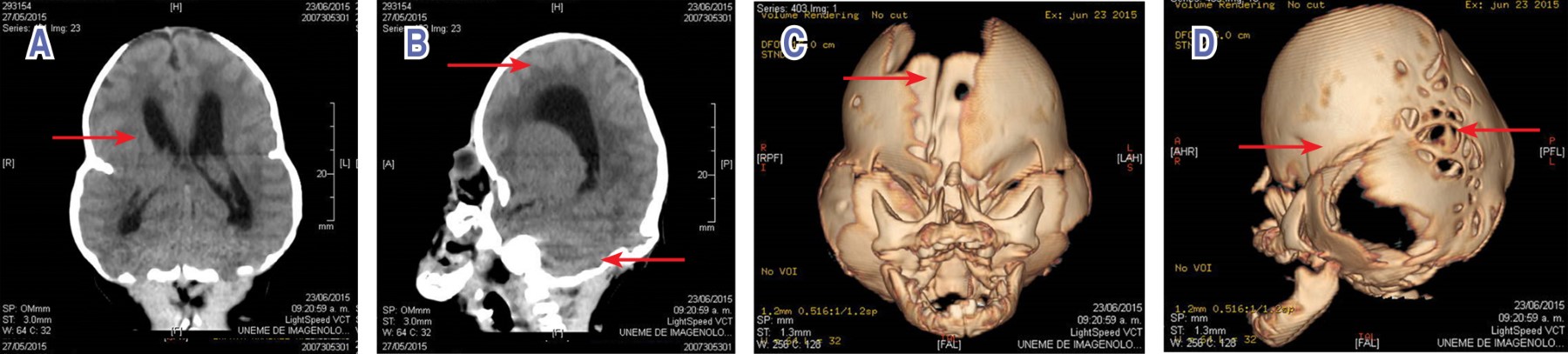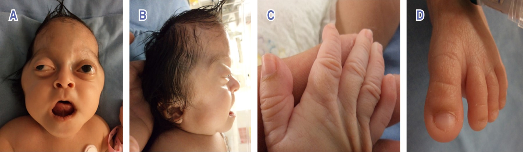 Clinical case: 26-day-old female, daughter of first pregnancy; 18-year-old mother and 23-year-old father, without consanguinity or inbreeding. It was obtained at term. Physical examination: cloverleaf skull, wide anterior fontanelle, wide forehead, bitemporal narrowing, hypoplastic supraorbital arches, and bilateral ocular proptosis. Upper extremities: broad thumbs, bilateral fifth finger clinodactyly. Lower extremities: broad first toes, bilateral fifth toe clinodactyly. Skull CT scan: fusion of the lambdoid, sagittal, and coronal sutures, ventricular asymmetry, with decreased density of the brain parenchyma, and cerebellar hypoplasia. At 35 days of life the patient died.