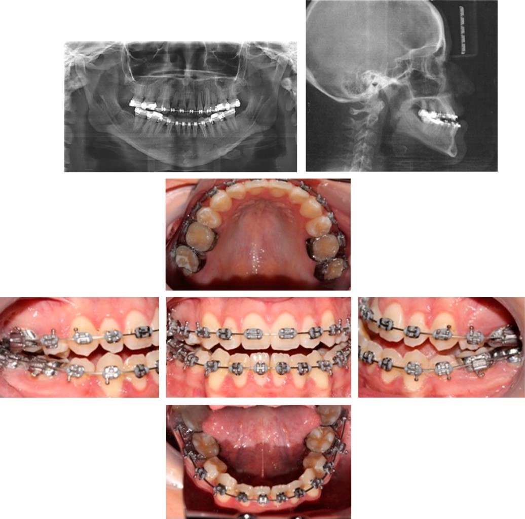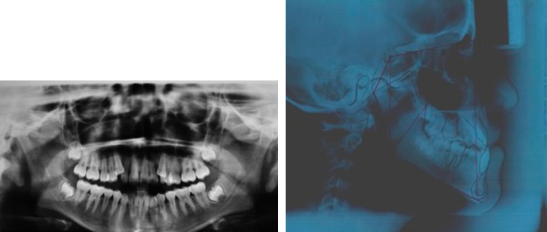 In the pre-surgical orthodontic phase, Roth slot 0.022" × 0.025" brackets were placed, first upper and lower premolars were extracted to relieve the crowding of both arcades, the prescribed sequence of archwires for this technique was followed 0.014", 0.016", 0.016" × 0.022", and 0.017" × 0.025", flexible archwires for alignment and levelling, double key steel archwires (DKL) until the space closure was achieved and reach at 0.019" × 0.025" steel arches necessary for the placement of surgical posts.