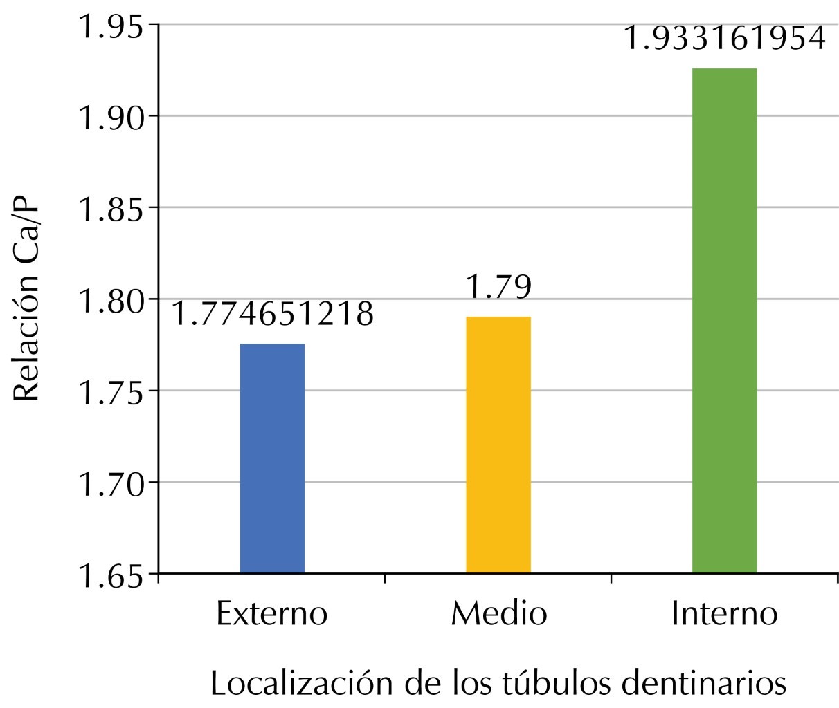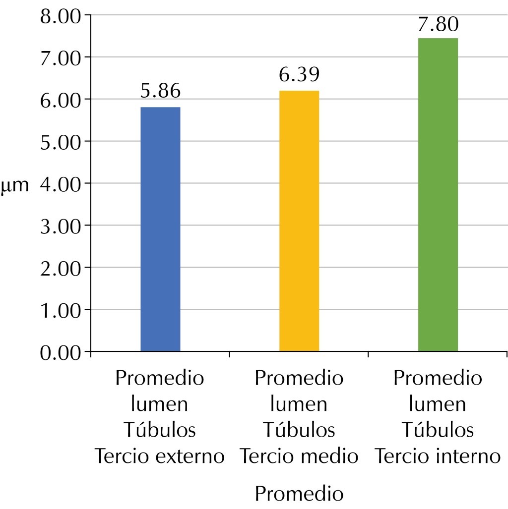 Dentin is composed of a calcium phosphate mineral identified as dahllite, which is arranged in small crystals of carbonated hydroxyapatite with dimensions of 36 × 25 × 4 nm, and by an organic phase whose main component is type l collagen in 90%, which is oriented in the form of a mesh. This conformation corresponds to permanent teeth. Within the structures, we find dentin tubules that measure approximately 0.5-1 μm in diameter at the periphery and up to 3-5 μm near the pulp. In the present study, carried out in dentin of primary teeth, the lumen of these tubules is larger when it is close to the dental pulp. Likewise, important elemental changes were found according to the different depths in which it was observed, finding an increase in the percentage weight of carbon when it is at a greater depth, indicating a greater organic composition in the pulp dentin. In studies of permanent teeth, this composition is decreased and with a higher concentration in the dentin near the amelodentinal junction. In dentin of primary teeth, differences were found in the count of dentin tubules per mm