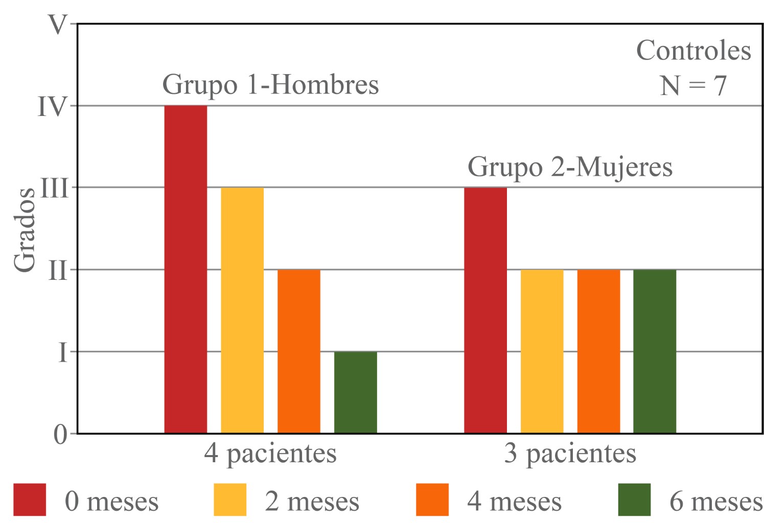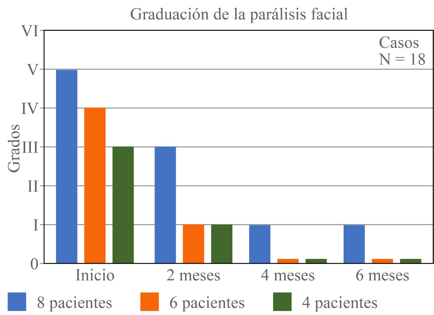 Introduction: So far there is no effective treatment for patients with chronic peripheral facial paralysis (PFP). Objective: A prospective controlled study was conducted to examine the efficacy of PFP muscle retraining in addition to oral alpha-lipoic acid administration. Material and methods: Case patients: 18 patients with subacute or chronic facial paralysis (at least one month to several years), eight patients with grade V according to the House Brackmann classification, six patients with grade IV and four patients with grade III were included. Control patients: seven patients, four patients with grade IV by House Brackmann classification, three patients with grade III functioned as controls receiving conventional treatment: vitamins and massages. Comorbidities: 10 patients with diabetes mellitus (DM2), hypertension, eight patients combined HBP and DM2. 12 patients with a mean evolution of two years and one to eight years of experience, glycated hemoglobin with x of 7.5 and 6.5 to 10.9%. All patients were treated with alpha lipoic acid at a dose of 600 mg daily for four months. And in addition to muscle retraining, muscle by muscle. Results: Cases: eight patients from grade V descended to grade III, after two months of treatment, they achieved complete recovery at four months. Six patients with grade IV and four patients with grade III recovered ad integrum after two months. Control patients with conventional treatment dropped one point from grade IV at two months and another point at six months, and their almost total recovery was achieved up to one year. Statistics. With high significance at a level of 0.5 (p < 0.05). Especially in the measurement of facial expression, comparing cases and controls (p < 0.05). Conclusions: These results demonstrate that muscle retraining (muscle-by-muscle massage therapy) for peripheral facial nerve palsy, including mirror feedback in combination with alpha lipoic acid, is a clinically effective treatment in patients with subacute and chronic facial paralysis.REFERENCES