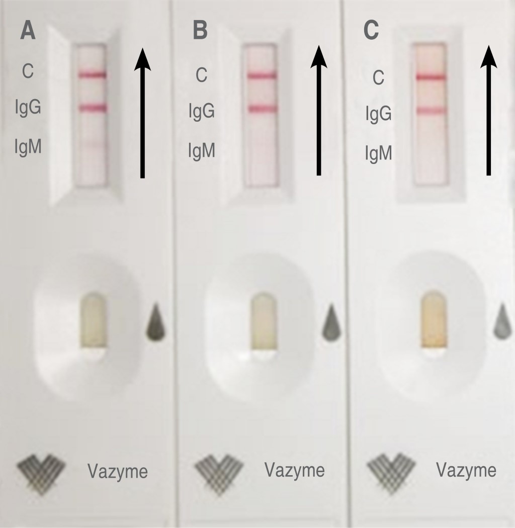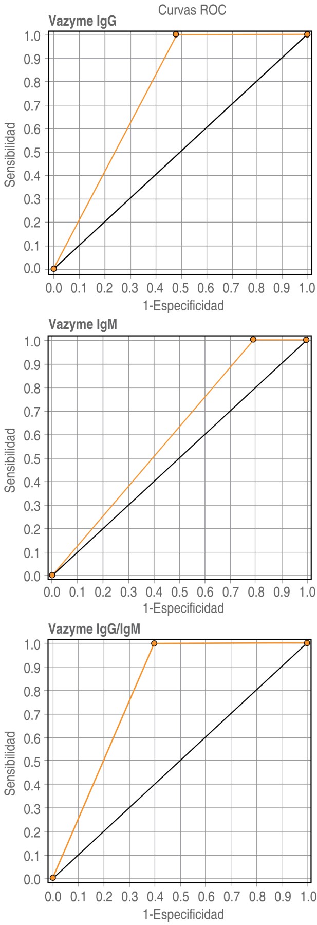 Results: Sensitivity and specificity were obtained individually (100 and 52% IgG Vazyme, 15.2% and 100% IgM Vazyme) and globally 100%, 60%, respectively.