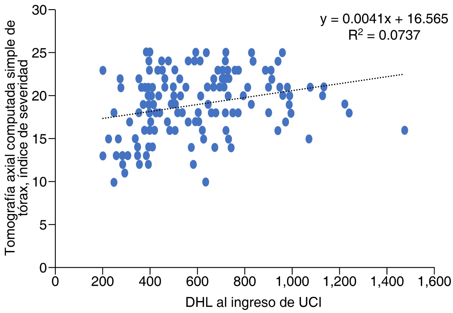 Material and methods: Observational, analytical, longitudinal and prospective study, carried out in two stages, the first (April 1, 2020 to September 30, 2020) consisted of a correlation study between serum LHD levels at Intensive Care Unit (ICU) admission and simple chest CT, a moderate correlation was obtained between serum LHD levels and severity score by pulmonary tomography, with an r = 0.5 and p < 0.0001; a severity-associated serum LHD cut-off point of 396 U/dL was obtained (p < 0.001, sensitivity 86.02%, specificity 75%). The second stage was extended until December 31, 2020, in which analysis is performed for diagnostic test performance, in inferential statistics correlation tests are performed, a multiple linear regression model is built, analysis was performed for diagnostic tests by building two-by-two contingency tables, determining sensitivity, specificity, positive predictive value, negative predictive value, likelihood ratios and Bayesian analysis.