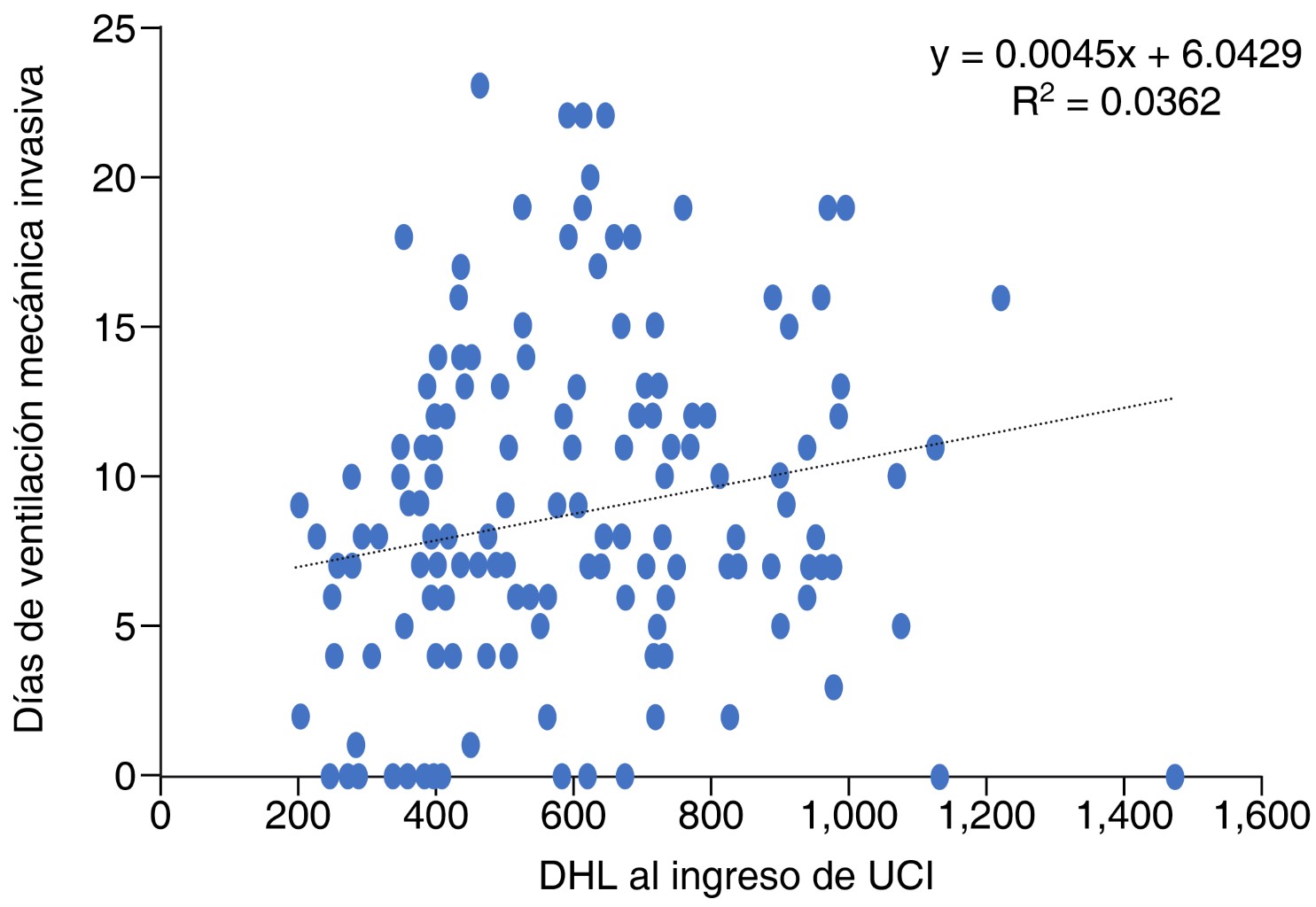 Results: 155 patients were included in the study to determine the diagnostic performance of serum LHD levels in patients with severe SARS-CoV-2 infection; by multiple linear regression analysis, it was determined that LHD levels on admission to the ICU is a predictor of severity in patients with SARS-CoV-2. A sensitivity of 0.92, specificity 0.41, with PPV 0.854, NPV 0.57 and an accuracy of 0.83, an LR + 1.57 and LR- 0.63 were obtained. In the post-test probability results, patients with DHL > 396 U/dL have a 86.3% probability of developing severe COVID-19. DHL levels have a direct correlation with ICU days of stay and days of invasive mechanical ventilation with statistical significance (p = 0.001, p = 0.033 respectively).