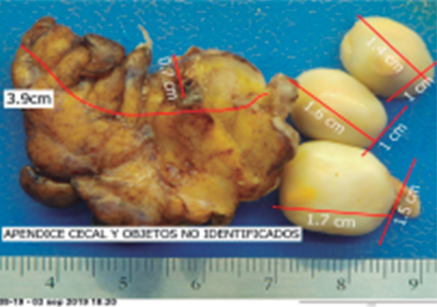 Mobile or free abdominal-pelvic masses are extremely rare and usually tend to be located in the pelvic area due to the effect of gravity.2 Within the differential diagnosis of mobile masses, the existence of free peritoneal bodies should always be kept in mind.3 Free peritoneal bodies, also called by some authors "peritoneal mice" or "peritoneal crumbs",3 are calcium-fibrotic formations found free in the peritoneal cavity. Since they are mostly asymptomatic, on many occasions they represent incidental findings during surgeries or autopsies.1 In the case of our patient, they were also asymptomatic since they did not confirm additional pathology to the appendicular condition. Only on some occasions, depending on the size and location, can they produce non-specific symptoms characterized by lower abdominal pain/discomfort, constipation, intestinal obstruction, or urinary symptoms such as polyuria or acute urinary retention.4 There is very little epidemiological data published on these neoformations; however, it seems that they are more frequent in males with a male-female ratio of 18:4, which coincides with the patient we present, and that they mostly occur between 50 and 70 years of age, although there are reports of their presence as young as two months of age.3 The few reports in the literature are mostly about single giant bodies larger than 5 cm in diameter,2-8 unlike the case we present in which we discovered not one, but three different peritoneal bodies, but smaller than those reported in the literature. In our hospital (HMG Coyoacán), no similar cases have been reported since 2016 to date.