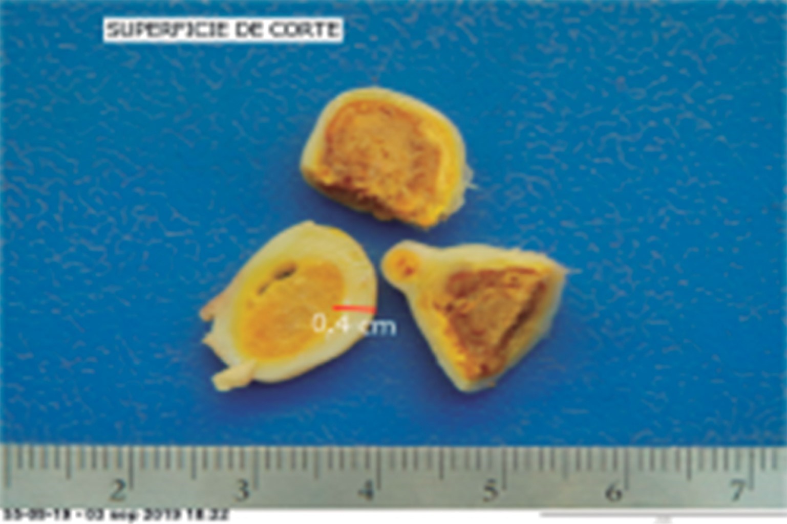 Macroscopic pathological analysis reported three ovoid neoformations of 17 × 15 × 10 mm, 16 × 10 × 10 mm, and 14 × 10 × 10 mm each, with a smooth, yellow, firm surface (Figure 3). When cut they are solid, with a 4-mm whitish gray peripheral thick zone and a yellowish central zone of firm consistency (Figure 4).