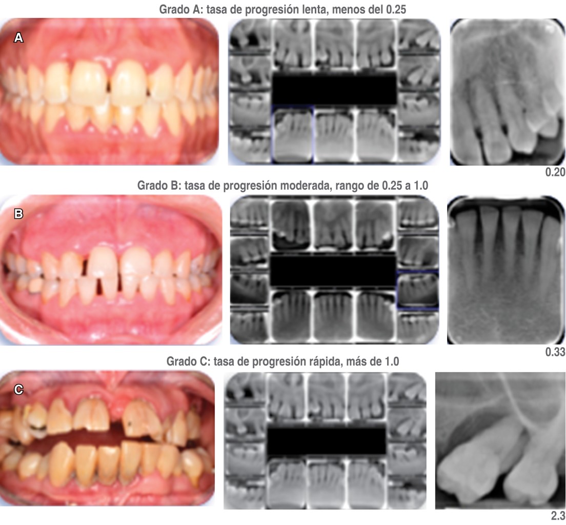 - c. Grades. The grade is an indicator of the speed or rate of progression of periodontitis that could be slow (A), moderate (B) or rapid (C). The main criterion for qualification can be obtained through: