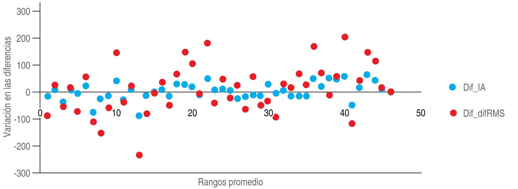 The dispersion of the differences in RMS (red) and the asymmetry index (blue) of each patient is observed. The behavior of these two variables does not show any pattern or trend of significant behavior over time. However, it is illustrated that half of the patients present negative and positive behavior (Figure 2).