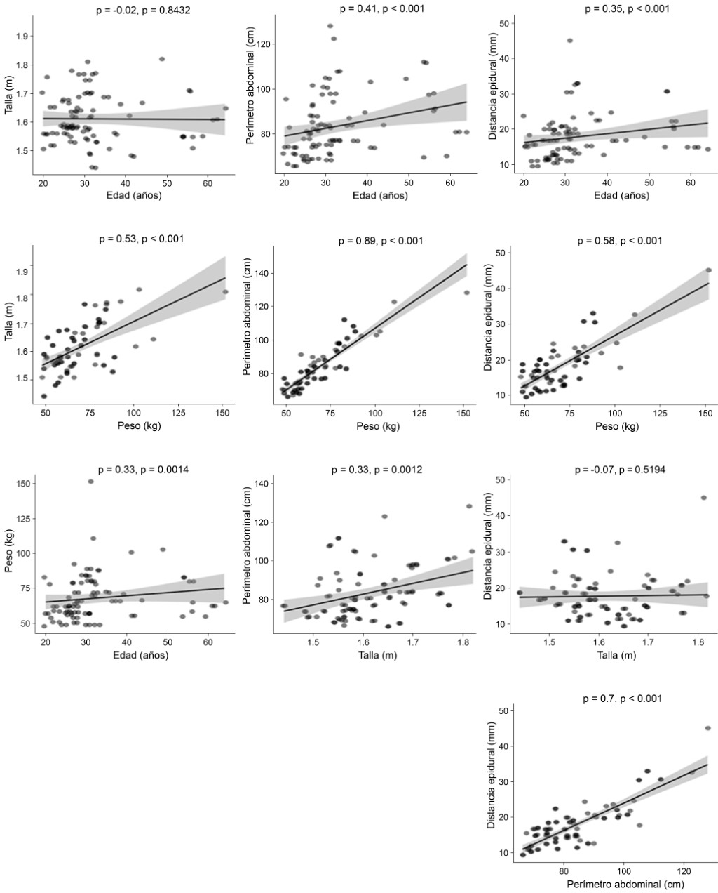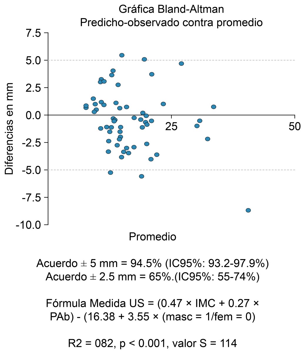 To have a predictive formula for the skin-peridural space distance (S-PD), 92 people were studied in a cross-sectional study. In all of them, the S-PD was estimated through an ultrasound study. The anthropometric measurements consisted of weight (kg), waist circumference (cm), body mass index (BMI), coupled with age (years) and sex. Employing multiple linear regression, it was determined that with weight, waist circumference, BMI, and sex, the S-PD could be estimated with a prediction of 94.5% b (95% CI: 93.2 to 97.9%) a difference of ± 5 mm of the ultrasound measure (Bland-Altman); R2 = 0.82, p < 0.0001. Conclusion: With the formula epidural distance (mm) = [(waist-circumference (cm) × 0.27 + BMI × 0.47)] - (16.38 + 3.55 [if male]) the skin-epidural space distance can be estimated without the need for ultrasound measurement.REFERENCES
