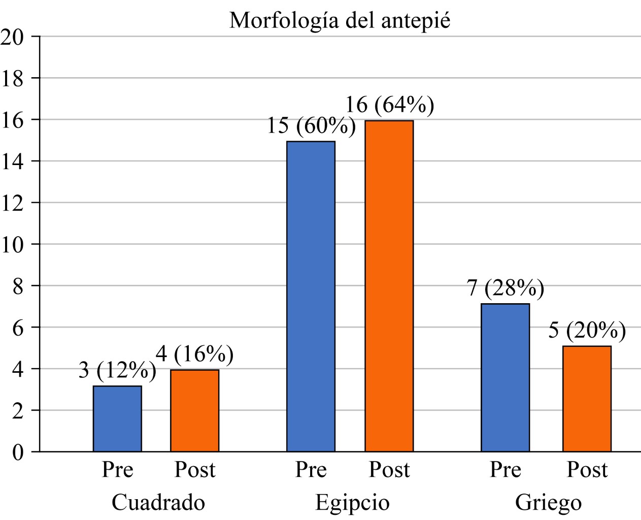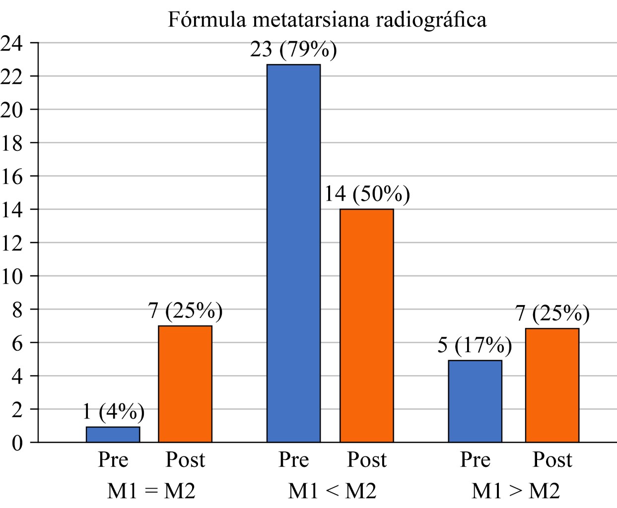 Results: The improvement in the final score exceeded 80 points in all cases (p = 0.000), with a significant improvement in pain (p = 0.000) and calluses (p = 0.000), improving metatarsal-phalangeal joint stability and interphalangeal and metatarsal alignment. The type of footwear did not change after surgery, we found no variation in mobility, neither in the metatarsophalangeal joints (p = 0.382), nor in the interphalangeal joints (p = 0.672). After surgery increased the square foot morphology (p = 0.027) but the metatarsal formula underwent few modifications. Patients and surgeons were in 96% of the cases "very satisfied" or "satisfied".