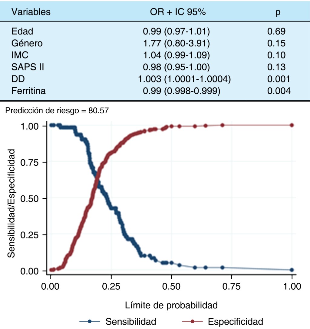 Results: We analyzed a total of 100 patients, the male sex prevailing in 78%. 18% had thrombosis. Initially the statistically significant inflammatory markers were DD (p = 0.010) with levels of 1375.5 ng/mL (967-2651) and ferritin (p = 0.030) with levels 1391.5 ng/mL (622-1779). With the adjustment of inflammatory variables by age, gender, Body Mass Index (BMI) and severity scales, the statistically significant variables were DD (p = 0.001) and ferritin (p = 0.004), obtaining a diagnostic certainty of 80.57% to predict risk of thrombotic events.