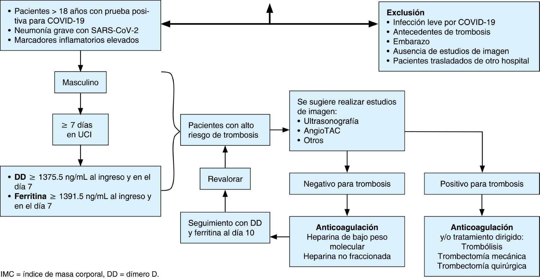 Introduction: SARS-CoV-2 pneumonia is associated with an important secretion of cytokines and agglomeration of immune cells, which activate endothelial cells conditioning coagulopathy, affecting the lung at an early stage, with a clinical phenotype of Acute Respiratory Distress Syndrome (ARDS), which later progresses to a systemic inflammatory response deregulated by inflammatory markers that cause greater endothelial injury generating thrombosis. Many patients present high levels of D-dimer (DD), as well as C-reactive protein (CRP), interleukin-6 (IL-6) and ferritin, subordinating the formation of clots, with the interruption of circulation (arterial or venous) at any level of the circulatory system.