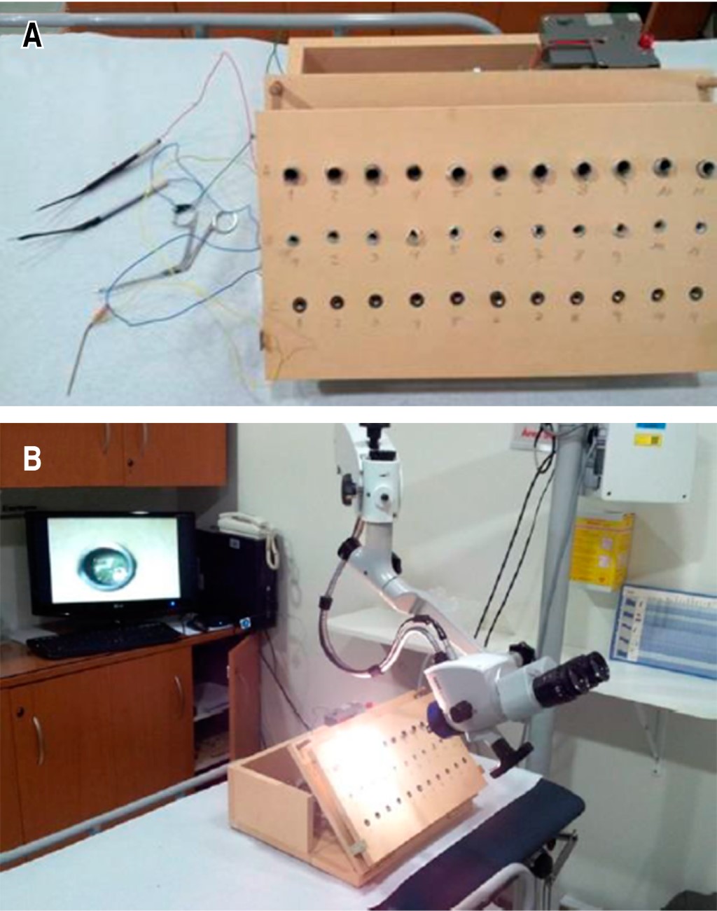 Results: The novice group obtained a lower score on the evaluation scale (p < 0.01), and higher total times of the procedure, of microscopic vision blockage and number of contacts than the other groups (p < 0.01). No significant differences were found between the intermediate and expert groups.