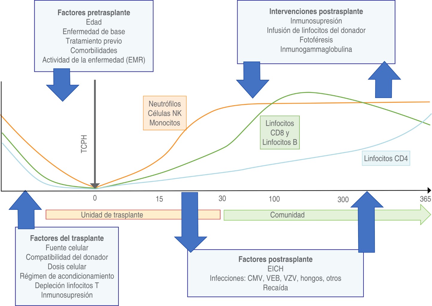Hematopoietic stem cell transplantation (HSCT) is the established treatment for children with leukemia that do not respond to chemotherapy, as well as benign alterations. Among the biological processes that generate the success of HSCT is the generation of an efficient immune system, establishing an environment of homeostasis between the different cellular and soluble (cytokines, chemokines) components to control several interactions between the cells that participate in the process. The complete reconstitution of adaptive immunity is often affected by several factors. Some of them are inherent to the transplant, which takes even years to obtain an adequate number of lymphoid cells with optimal functionality. Adaptive immune reconstitution takes a long time, which increases the risk of failing to respond against opportunistic infectious agents. Moreover monitoring the factors that directly influence the success of the graft, T lymphocytes subpopulatios, and NK cells should be quantified. This correlates with the clinical status and the progress in cellular reconstitution allowing the identification of the ideal moment to carry out interventions that accompany the long recovery period. This is in order to contribute to achieving a state of immunocompetence of the individual.