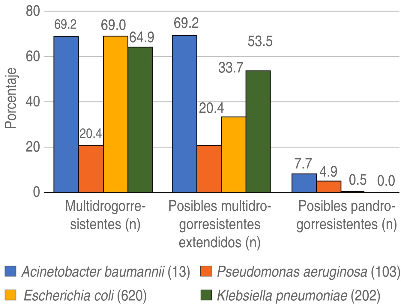 Results: Escherichia coli was the most prevalent bacterium presenting BLEE strains with 69.3%. Acinetobacter baumannii was the bacterium that presented the highest possible pandrug resistance with 7.7%. A 6.5% resistance to colistin was found in Pseudomonas aeruginosa.