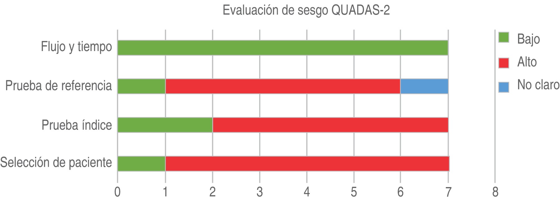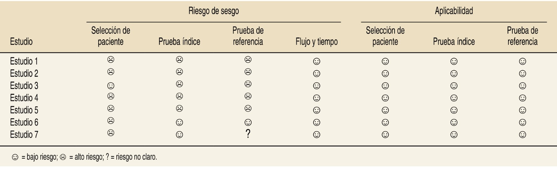 Ciapponi A. QUADAS-2 : instrumento para la evaluación de la calidad de estudios de precisión diagnóstica. Evidencia. 2015;22-26. Disponible en: http://www.foroaps.org/files/64fe85009abba8c506e903adf90dbc17.pdf