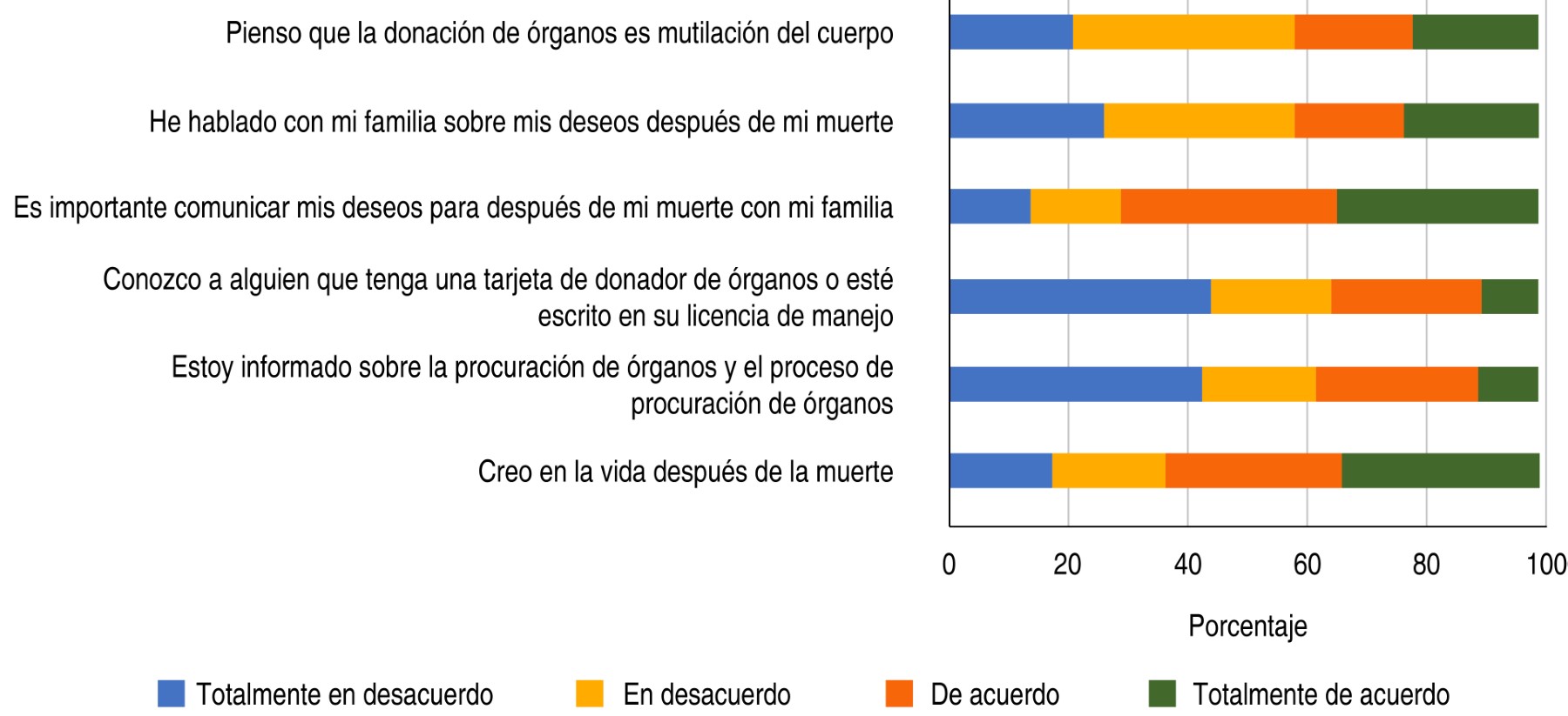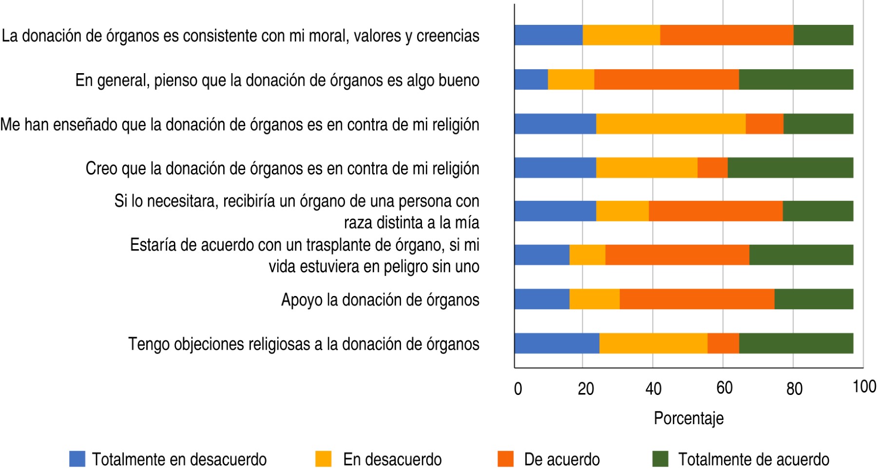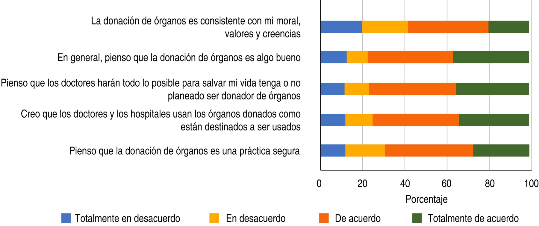 Results: It included 347 beneficiaries, 55% (192) women, age 42 ± 15 years, 40% married, 83% Catholic. The total score was between 20 and 71, 41.5% agree with donating their organs after death, 43.5% have religious objections, when comparing the scores obtained for the different dimensions, a significant difference was obtained between religion and potential donor (ANOVA 0.041), in the overall score, opposition and approval there was no difference. A significant difference was observed in relation to gender, education and age in relation to the global score, opposition, approval and potential donor (0.000).