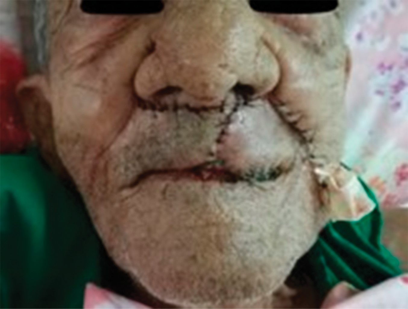 Basal cell carcinoma constitutes 80-90% of all skin cancers and is the most common tumor in humans. It causes a significant impact on the quality of life, with functional and aesthetic morbidity. The anatomical location of the tumor makes us consider reconstructive management, the lips being one of the most complex tumor sites to treat. The reconstruction of large defects of the upper lip constitutes a challenge for the surgeon due to the expectation its results generate not only functional, but also aesthetic. We present the case of a patient with an ulcerated nodular basal cell carcinoma on the upper lip, which was treated by excision and reconstruction with an ipsilateral Gillies fan flap and a contralateral perialar flap with good results.