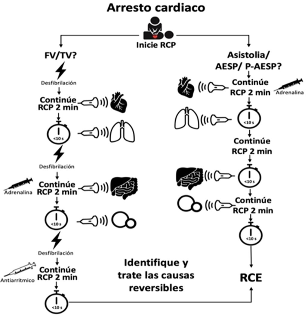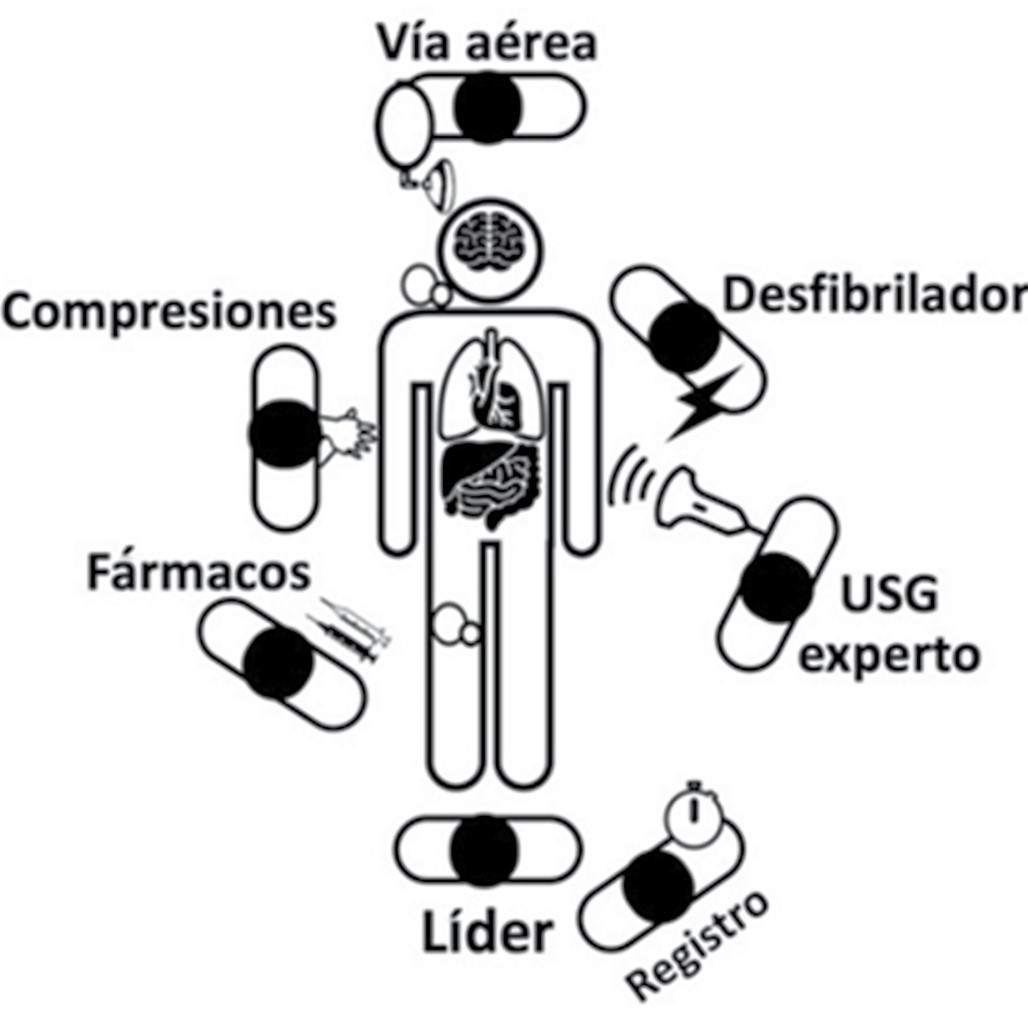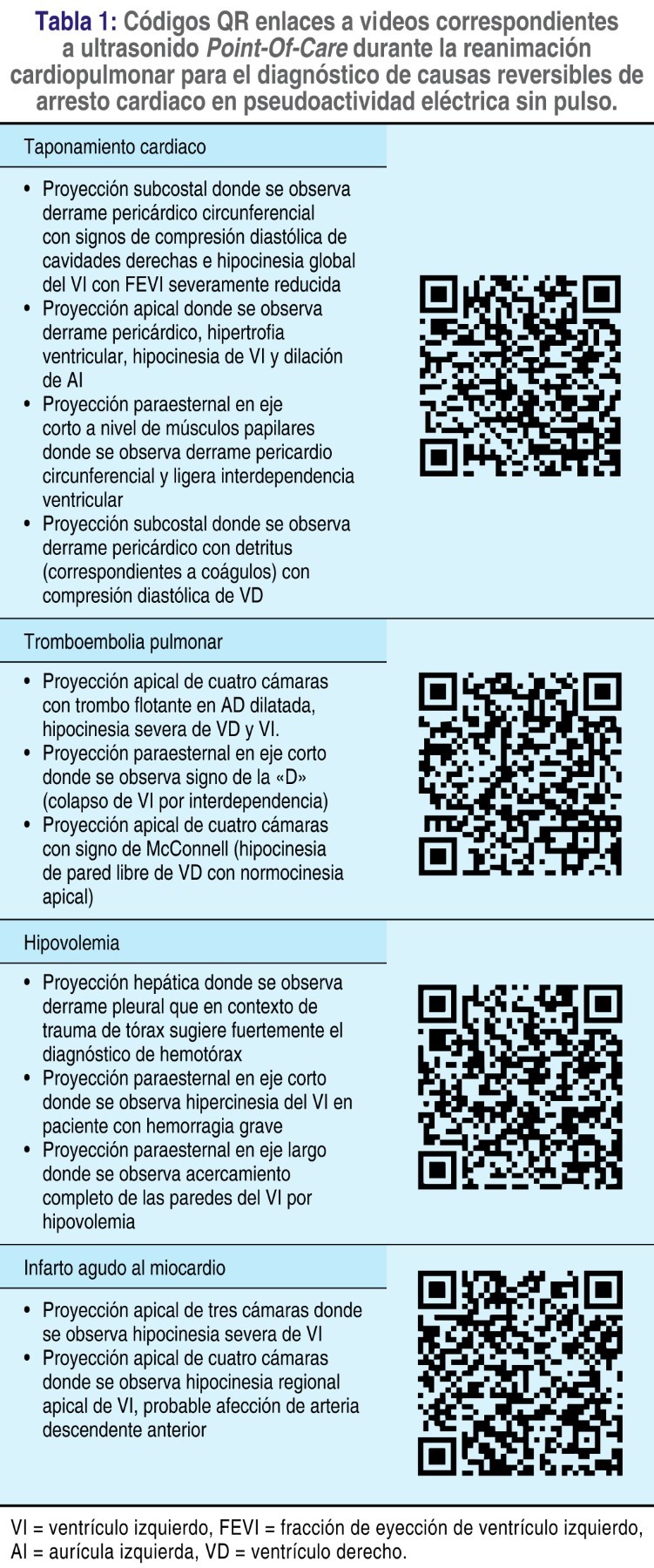 Ultrasound focused on the critical patient or "Point-Of-Care ultrasound" (POCUS) is a tool used at the patient's bedside in different areas of critical medicine and emergency services due to its practicality as it provides great information quickly and non-invasive for diagnostic and therapeutic approaches. Cardiac arrest (CA) is a critical situation that requires adequate cardiopulmonary resuscitation (CPR), and in which the identification of the etiology is crucial to carry out a rapid intervention and achieve its resolution, particularly in the setting of a pulseless electrical activity (AESP) in which ultrasound is of vital importance. The implementation of cardiopulmonary resuscitation protocols supported by an ultrasound approach is feasible and of great utility for the etiological identification of CA and the resolution of specific causes.