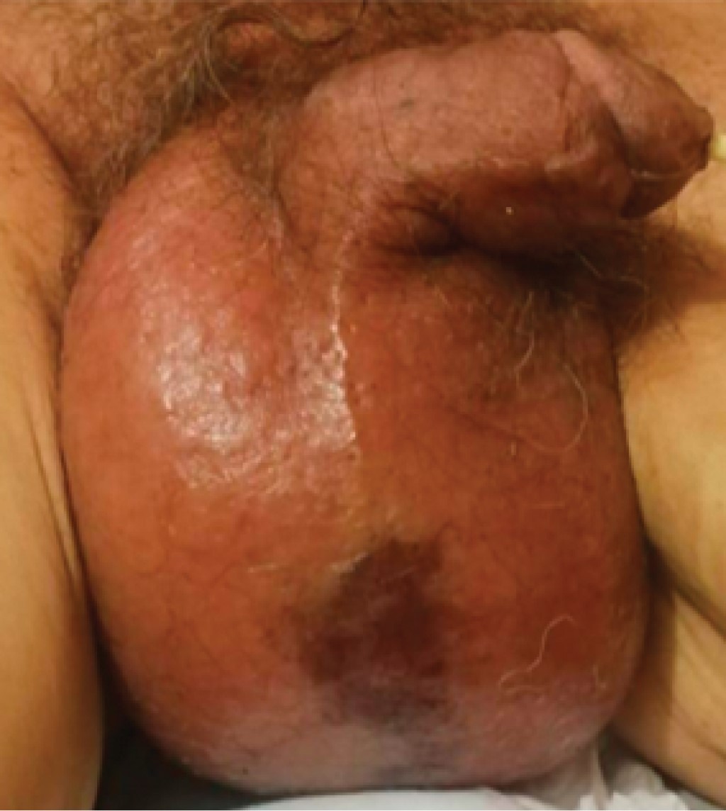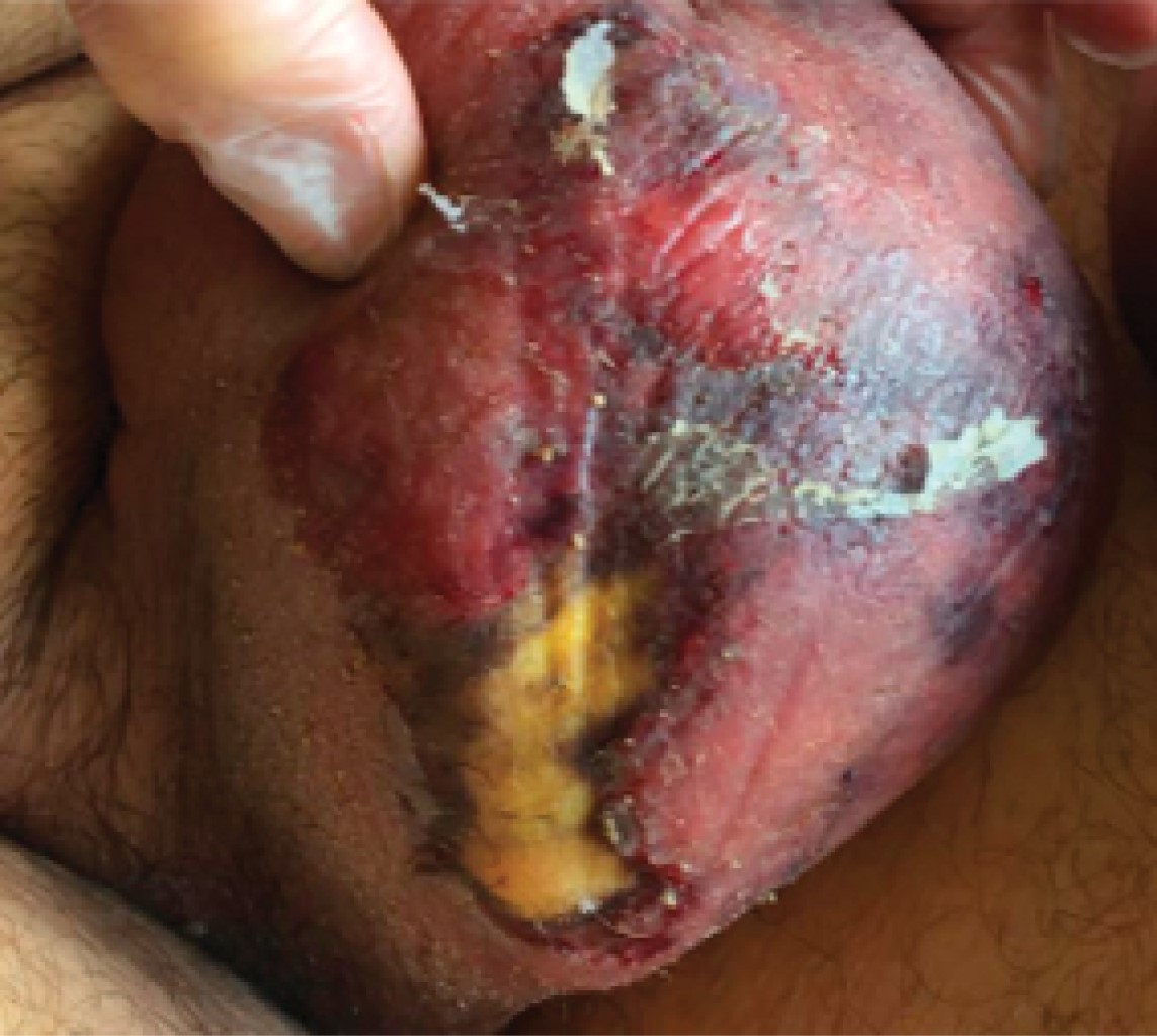 Differential diagnoses should be made with dermatological and systemic pathologies such as scrotal cellulitis, testicular torsion or abscess, acute epididymitis, balanitis, strangulated inguinoscrotal hernia, vasculitis, occlusive vascular syndromes, polyarteritis nodosa, erythema necrolytic migrans, herpes simplex, and warfarin necrosis.5,29