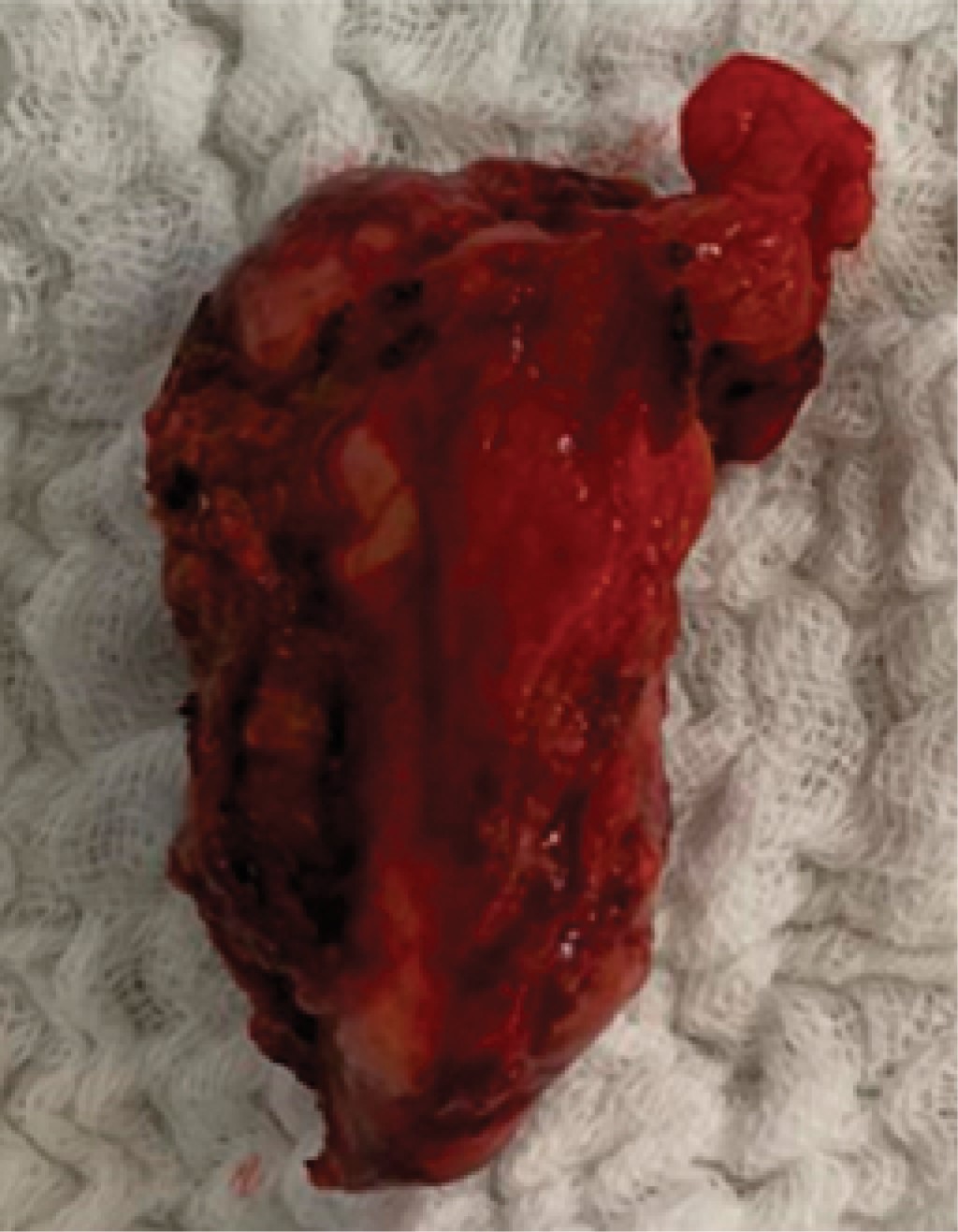 The management of ruptured hepatocarcinoma depends on the hemodynamic status of the patient, the degree of tumor burden, and the underlying liver function. Transarterial embolization (TAE) has now been found to be an effective option to control bleeding in patients whose hemodynamics are impaired and provides a time to assess the patient's condition and tumor burden. This bridging strategy is now offered for subsequent definitive and curative surgical treatment in selected patients. TAE has a hemorrhage resolution rate of 53 to 100% of cases.3 Studies are comparing the three types of treatment whose results show greater survival in patients in whom hepatic resection was performed versus TAE or conservative management.6 Conservative treatment of ruptured HCC is rarely used alone; its indication is in hemodynamically stable patients with minimal blood loss or those without surgical indication and those receiving palliative treatment. In-hospital survival with this alternative is 49%, and only 1% survival at one year.7 In our case, it was decided to perform a hepatic resection because the patient came to our clinic with acute abdomen and hemodynamic alteration. In the trans-surgical examination, active bleeding was observed at the level of the hepatic tumor, for which reason the decision above was made.