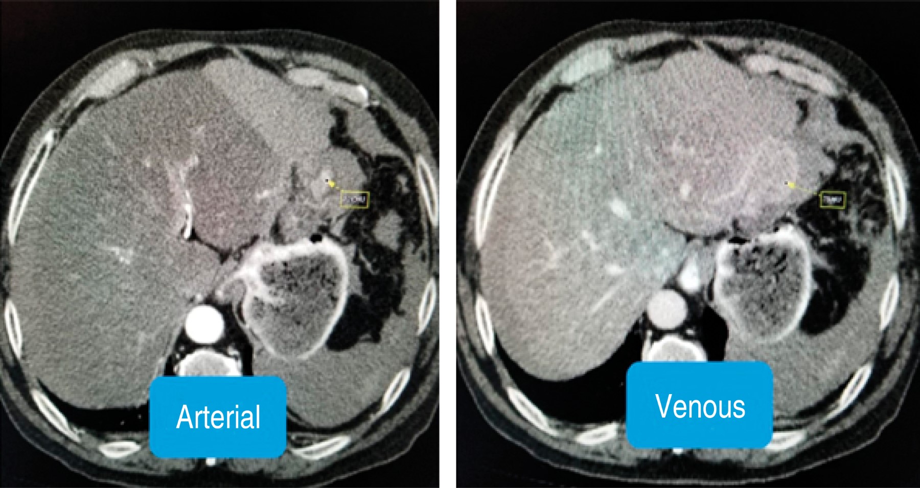 Hepatocellular carcinoma (HCC) is the most common primary malignant neoplasm of the liver worldwide; it represents 90% of liver neoplasms,5 with approximately 500,000 cases diagnosed per year. Spontaneous rupture occurs in 20% of the cases producing hemoperitoneum, with which the mortality rate increases up to 25%.6 The imaging test of choice for diagnosis, treatment, and define the extension of liver tumors is the three-phase tomography, which has a diagnostic accuracy of 68 to 90%.5