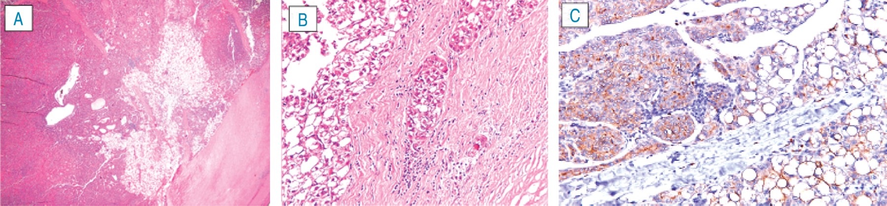The histopathology report of segment II of the liver concluded a hepatocellular carcinoma with the proliferation of cells arranged in a mixed pattern (trabecular, acinar, and clear cell) with invasion of the capsule (Figure 3) but with free borders, for which clinical oncology was consulted for follow-up and complementary treatment.