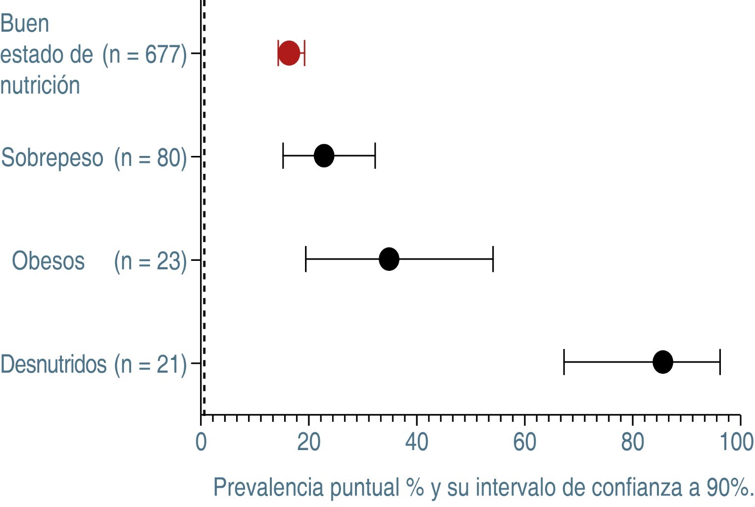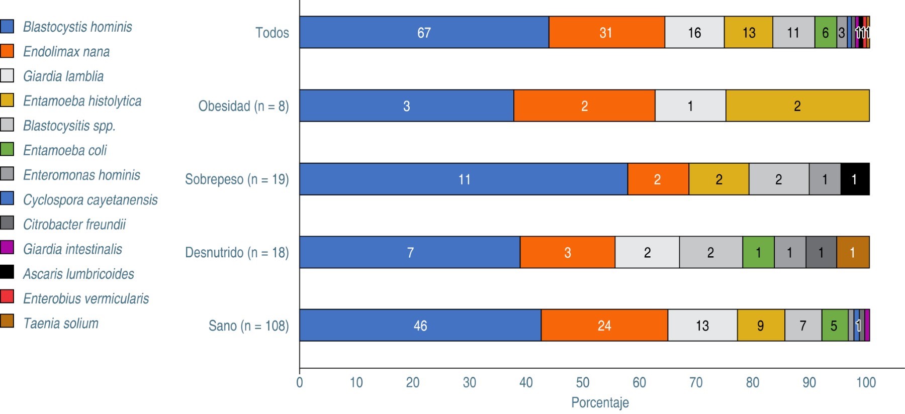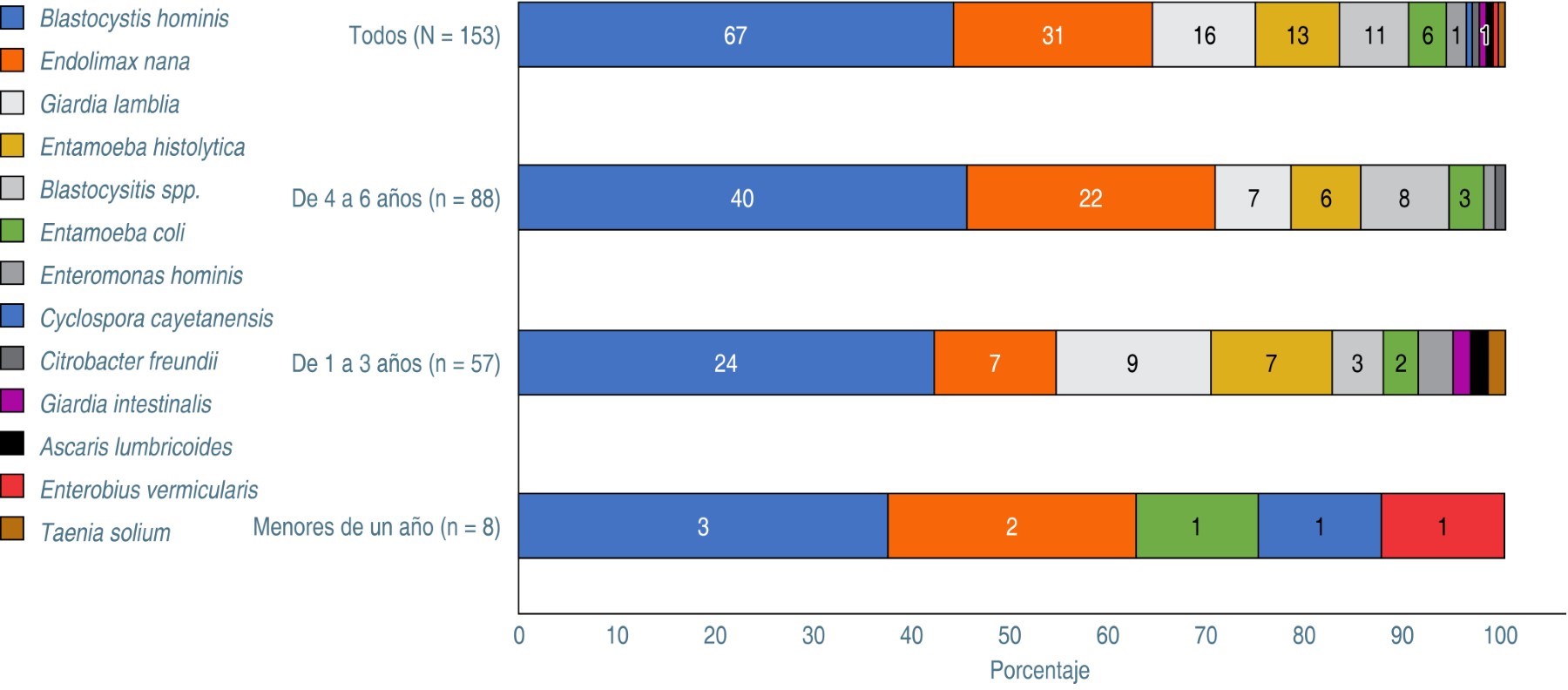 Results: the prevalence for intestinal parasitosis was 19.1% (153/801), but it was higher in ≤ 3 years old (56/151, 37.1%), and in malnourished children (18/21, 85.7%). The most frequent parasite was Blastocystis hominis (45%), followed by Endolimax nana (20.3%) and Giardia lamblia (10.5%).