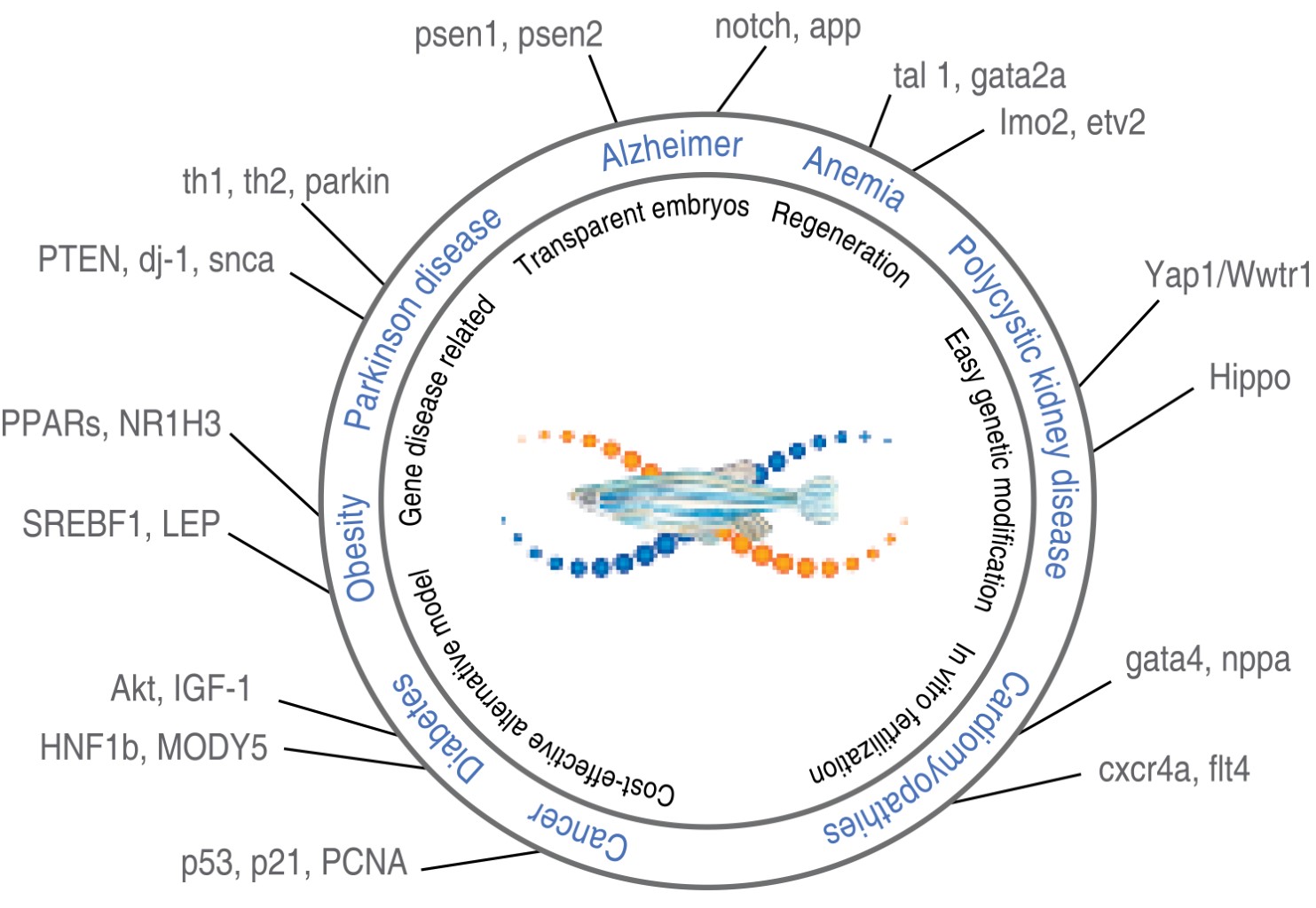 Zebrafish is a popular model for vertebrate development and genetic studies.7 Since the introduction of the zebrafish as a model in 1974 by George Streisinger,8 zebrafish has become the second most used vertebrate in research and an invaluable model for translational research.9 The reason for this popularity is the many advantages that this model has. The zebrafish genome is well curated by multiple databases, allowing the identification of zebrafish orthologs for most human genes. Approximately 72% of human genes have at least one ortholog in the zebrafish genome, with 84% of known human disease-causing genes having a zebrafish counterpart.10 Combined with numerous techniques that have been successfully adapted to this model has enable relatively straightforward reverse genetic manipulation of genes of interest generating a great number of models for diseases of interest.11,12 Additionally, the zebrafish has high fecundity, rapid and external development, a small size and an optical clearance of the embryo. Altogether makes the zebrafish an excellent complementary model to the mouse.