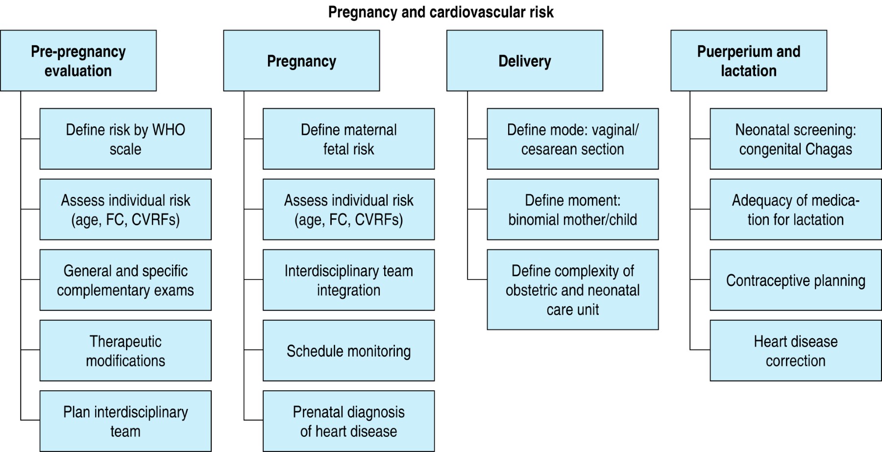 Pregnancy in women with heart disease challenges the treating team. It requires an individualized evaluation and interdisciplinary follow-up that, in the ideal scenario, should begin in the pre-gestational stage. In addition, pregnancy provides a valuable opportunity to indicate lifestyle modifications that will impact maternal and offspring cardiovascular health (Figure 1).