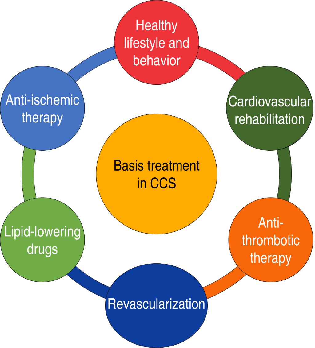- 3. Anti-ischemic therapy: β-blockade and calcium channel blockers are the first lines to reduce angina, but they have not shown an effect on survival. Short-acting nitrates are reserved as a rescue medication, while long-acting nitrates are used as the second line. Ranolazine could be used in patients with refractory symptoms despite therapy.1,2