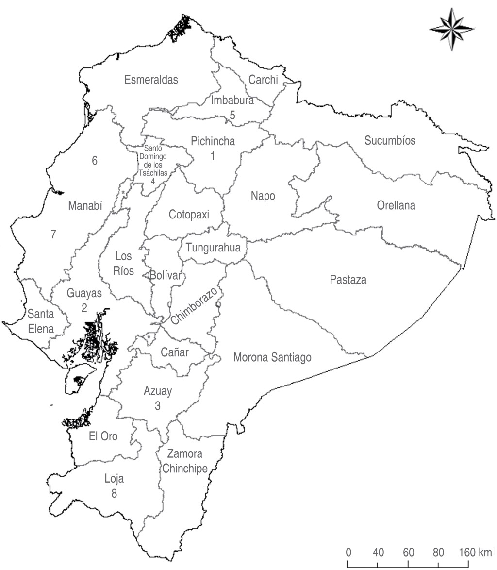 Between February and May 2014, a knowledge, attitudes, and practices self-designed survey consisting of eight questions, that were previously validated among other professors at the School of Dentistry, was applied to a representative number of dentists (based on a sample size calculation equation) from different cities in Ecuador (Quito, Guayaquil, Cuenca, Santo Domingo, Ibarra, Loja, Manta and Portoviejo; Figure 1). Surveys were done by direct interview at each dentist´s office and after explaining to them the objective of the study and answering any questions they might have. The survey requested information about the city where they practice and whether they were general practitioners or specialists and the university they graduated from and the year they got their degree. The survey placed two clinical scenarios to choose from to treat either one of them, which in this case were an acute, periapical abscess or an acute periodontal abscess. The main purpose behind the survey was to find out what the treatment for this condition was from the point of view of each professional regardless of the pathology they choose. The clinical condition was only a set point to target treatment. There was no right or wrong answer, the purpose was to evidence the treatment that the professional was going to apply, and if it involved the use of antibiotics. If the treatment included the use of antibiotics, the name of the drug was requested, the dosage, regimen, and duration of the treatment as well as if they use any prophylactic antibiotic therapy. Data was introduced into an electronic database and later analyzed using the statistical package GraphPad InStat version 3.00 (GraphPad Software, San Diego, CA, USA).