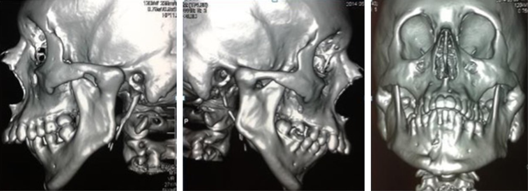 Therefore, the patient was prepared for mandibular ankylosis release surgery, and complementary examinations were requested (tomography with axial and coronal sections and 3D reconstruction) (Figure 1).