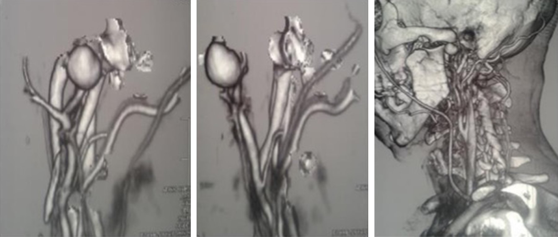 Surgical procedure: under general anesthesia with nasotracheal intubation with fiberscope, a preauricular approach with temporal extension was performed. During the surgical procedure, the right mandibular ankylosis was released without any complication, at the end of the procedure the process of releasing the left ankylosis was started, during the osteotomy, there was abundant and continuous arterial bleeding, and conventional hemostasis maneuvers were applied, during the osteotomy, there was abundant and continuous arterial bleeding, conventional hemostasis maneuvers were applied, using thermal techniques and ligation of all the probable surrounding arteries, the bleeding did not stop, so a compressive tamponade was left in the area and the patient was transferred to intensive care for four days, in which the angioTAC study was performed, which determined the presence of an aneurysm of the superficial temporal artery (Figure 2).