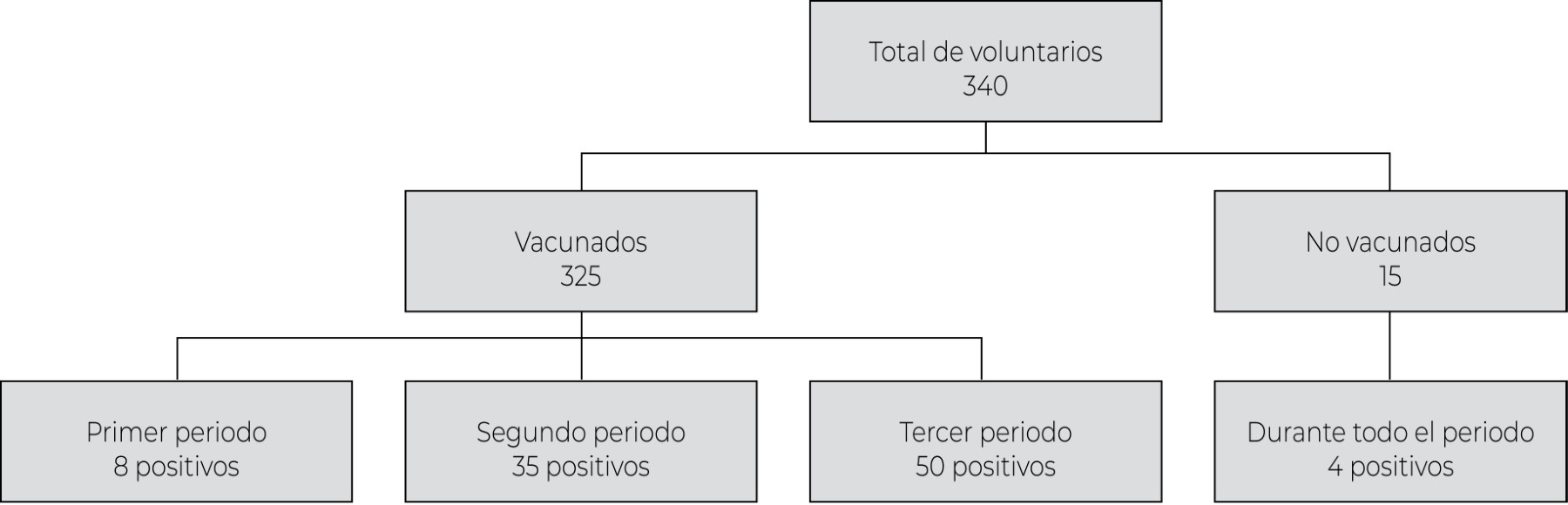 Results: 340 health workers were studied; 325 vaccinated and 15 unvaccinated. Of 325 vaccinated with the first dose, 8 were positive for SARS-CoV-2, second dose, 35 of 286 and booster in 272, 50 tested positive, 4 of 15 unvaccinated tested positive. The effectiveness for the first dose was 97.5%, the second 95.2% and the booster 9.91%.