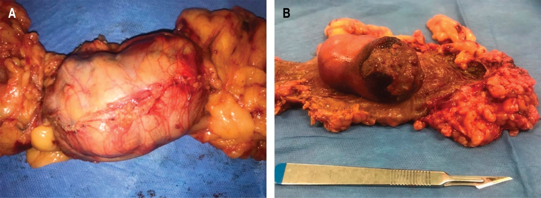 Contrast tomography (CT) scan of the abdomen showed, at the level of the transverse colon, a well-demarcated tumor, measuring 4.6 × 7.7 × 6.5 cm, with a density of 115 Hounsfield units (a quantitative scale used in CT scans to describe the different levels of tissue radiodensity), invaginated into the lumen of the transverse colon itself and with a discrete inflammatory process of the perilesional fat (Figure 1).