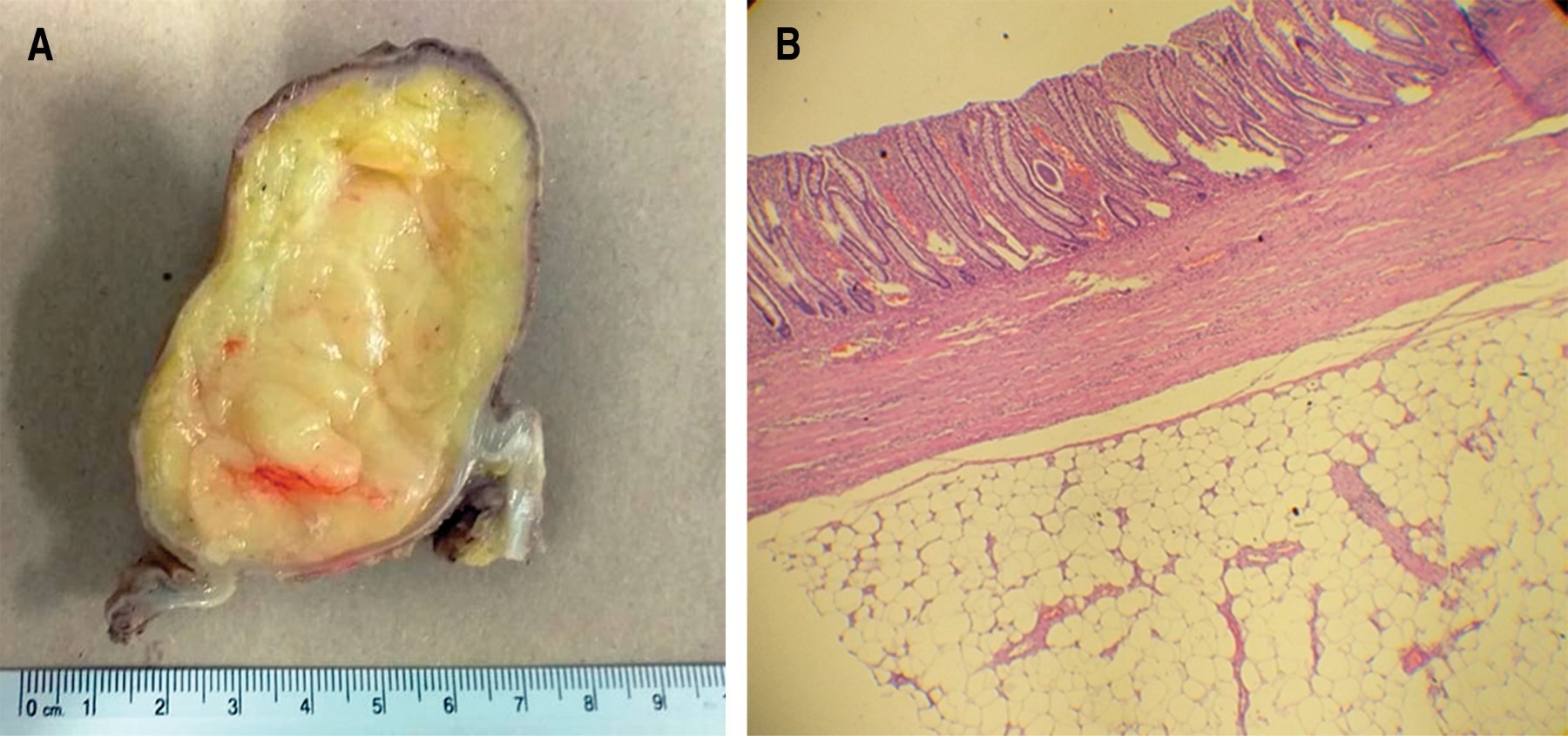 Gastrointestinal lipoma is a benign, sporadic, and usually asymptomatic tumor that can be located in any segment of the gastrointestinal tract. Most of the time this type of tumor is detected incidentally by computed tomography (CT) scan or colonoscopy performed due to any other indication.1 If symptoms are present, abdominal pain, bleeding, and changes in bowel movements are the most found.
