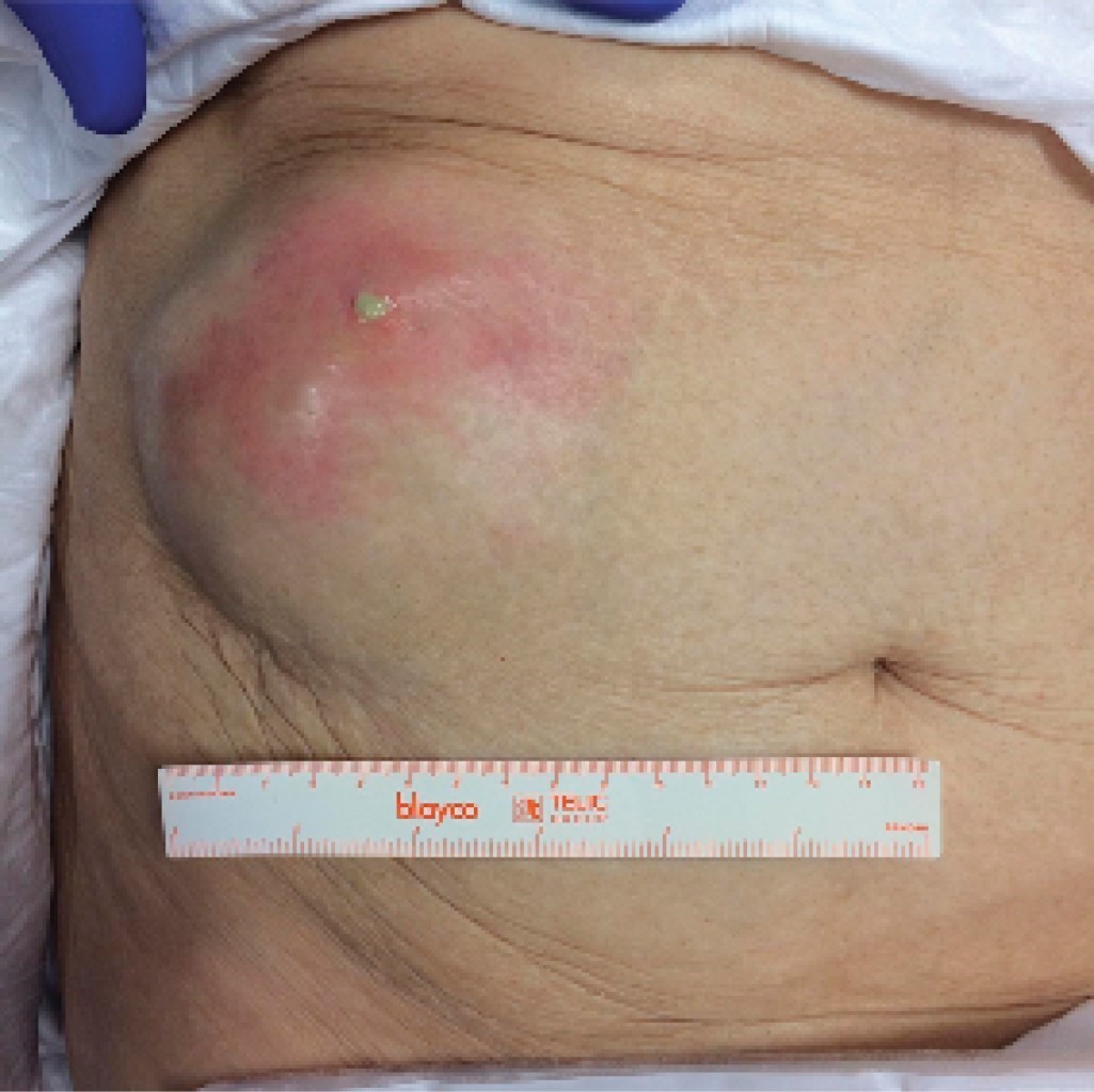 Case 1. A 92-year-old woman, diabetic and institutionalized for dementia. She consulted for a painless and progressively growing tumor in the RHC during the last weeks. On examination, the mass had a diameter of 10 cm, with fluctuation and purulent exudate seen through a small solution of continuity (Figure 1). Suspecting an underlying CCF, an abdominal CT scan was performed with findings of multiple choledocholithiasis and perforated cholecystitis towards the abdominal wall musculature, with a collection in the subcutaneous tissue measuring 10 × 10 × 6 cm.