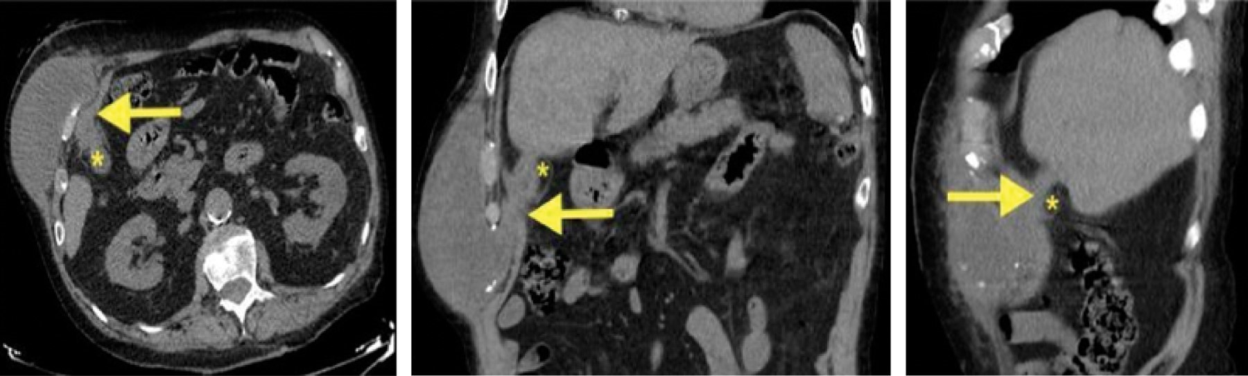 Case 3. An 83-year-old man, independent for ADL, hypertensive, with dyslipidemia and with chronic obstructive pulmonary disease, consulted for a painful mass in the RHC of four days of evolution. It had a size of 15 × 20 cm and fluctuation. An abdominal CT showed a subcutaneous collection of 10 × 6 × 9 cm over a fistulous tract involving the abdominal wall musculature, and the hepatic angle of the colon that continued through the subhepatic space to the gallbladder, showing chronic parietal thickening, lithiasis, and aerobilia.