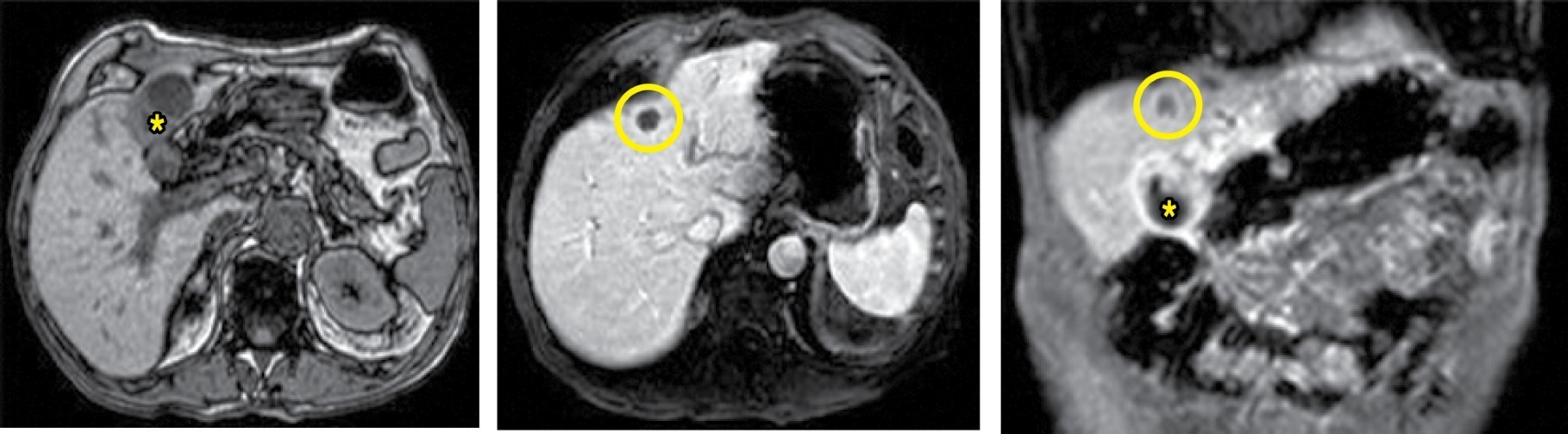 A percutaneous drainage of the abscess was performed, and AB treatment was given. A subsequent MRI cholangiography showed heterogeneous thickening of the gallbladder wall, adenopathy in the hepatic hilum, and the focal lesion in the hepatic segment IVb previously described (Figure 4). A biopsy of the hepatic lesion was performed, with an immunohistochemical result of metastatic adenocarcinoma of biliopancreatic origin. The PET-CT extension study showed pathological uptake in the gallbladder, hepatic hilum, segment IVb lesion, and a nodule in the right lung. Palliative chemotherapy and placement of a biliary stent were indicated, with immediate good evolution regarding the resolution of the septic picture and FCC. He died 14 months after the diagnosis of gallbladder neoplasm.