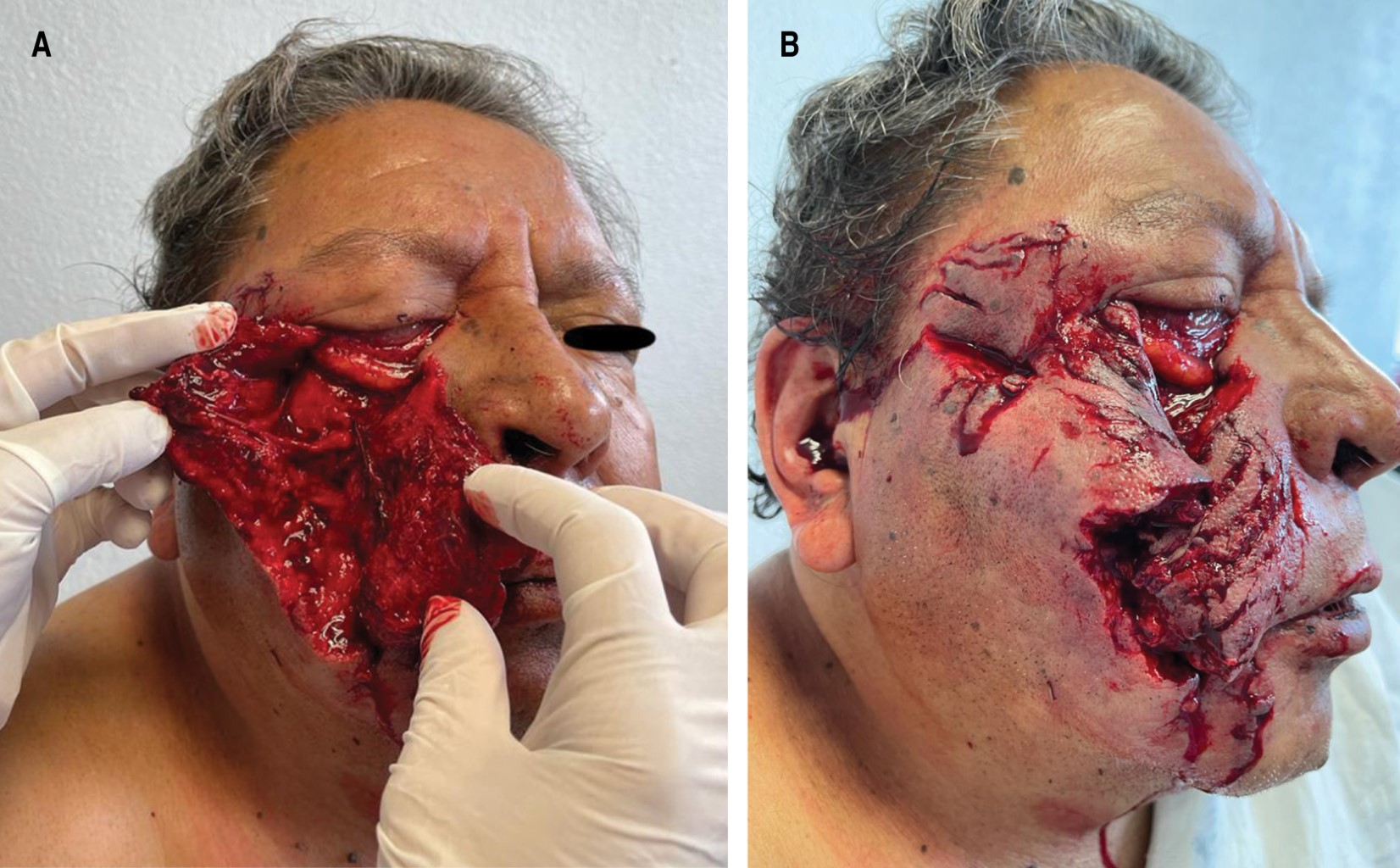 Among mammals, dog bites to humans occur the most frequently (between 85 and 90 %). There is a high incidence in Mexico, around 110.44 cases per 100 thousand inhabitants. After the accident, the patient should first be stabilized and the wound should be washed with plenty of water or sterile saline solution (NaCl 9%). For primary closure, there are proposals for large facial wounds and disfiguring with less between eight and 12 hours of evolution. We attended a 68-year-old man bitten by a familiar dog, in the Lackmann III facial region. Stabilization, lavage and debridement of necrotic edges and hemostasis of the surgical site were performed; the wound was closed in planes and antimicrobial treatment with amoxicillin/clavulanic acid 500/25 mg orally, every 8 hours, for seven days, was started. Every dog bite involves a risk of infection, but this risk depends on the characteristics and site of the injury, as well as its prompt management and initial lavage. It is important to be aware of the medical action to be taken in case of dog bite wounds in any part of the body; as well as, to refer patients to a specialist to have a better attention and ensure a promising evolution.
