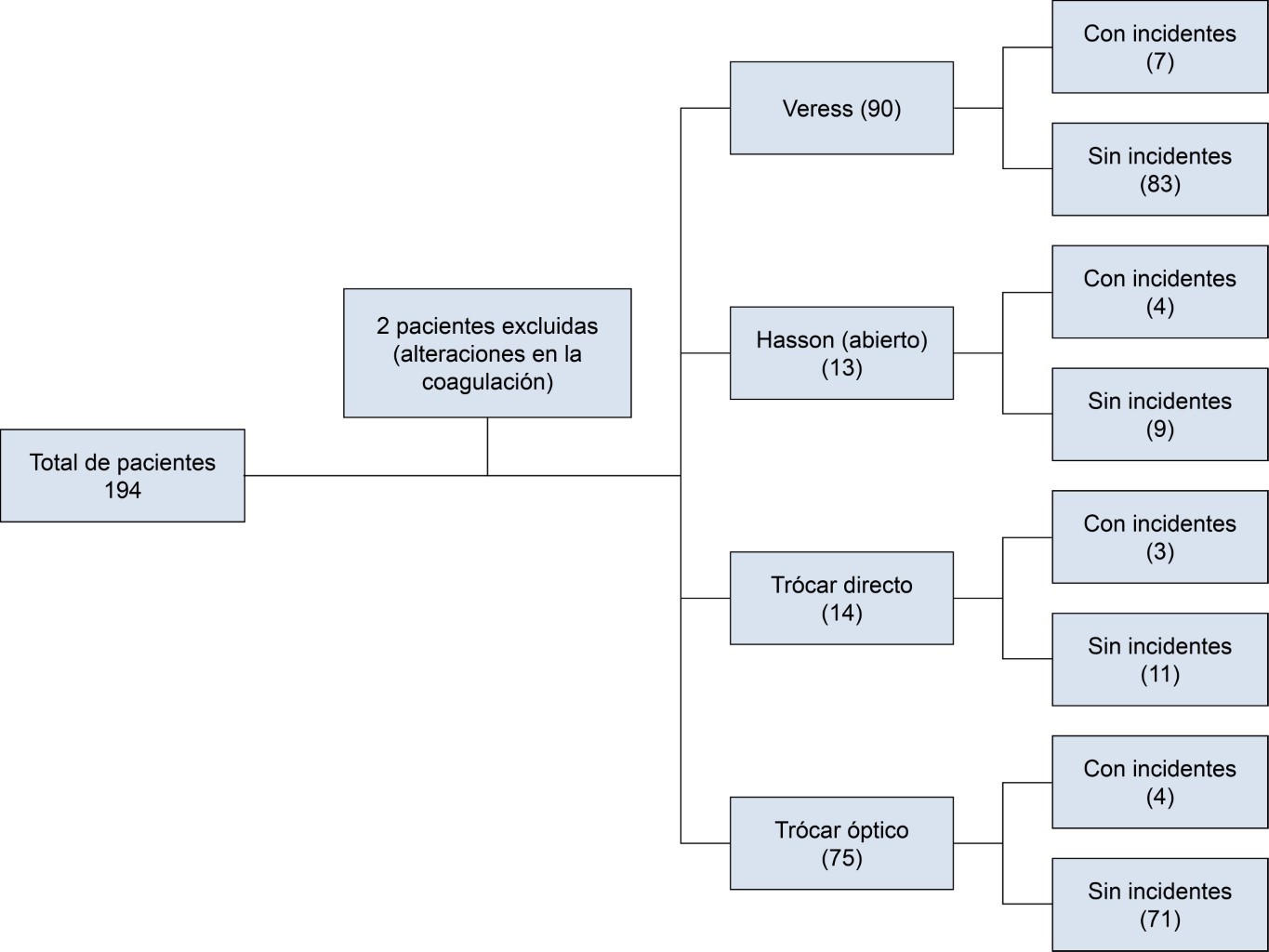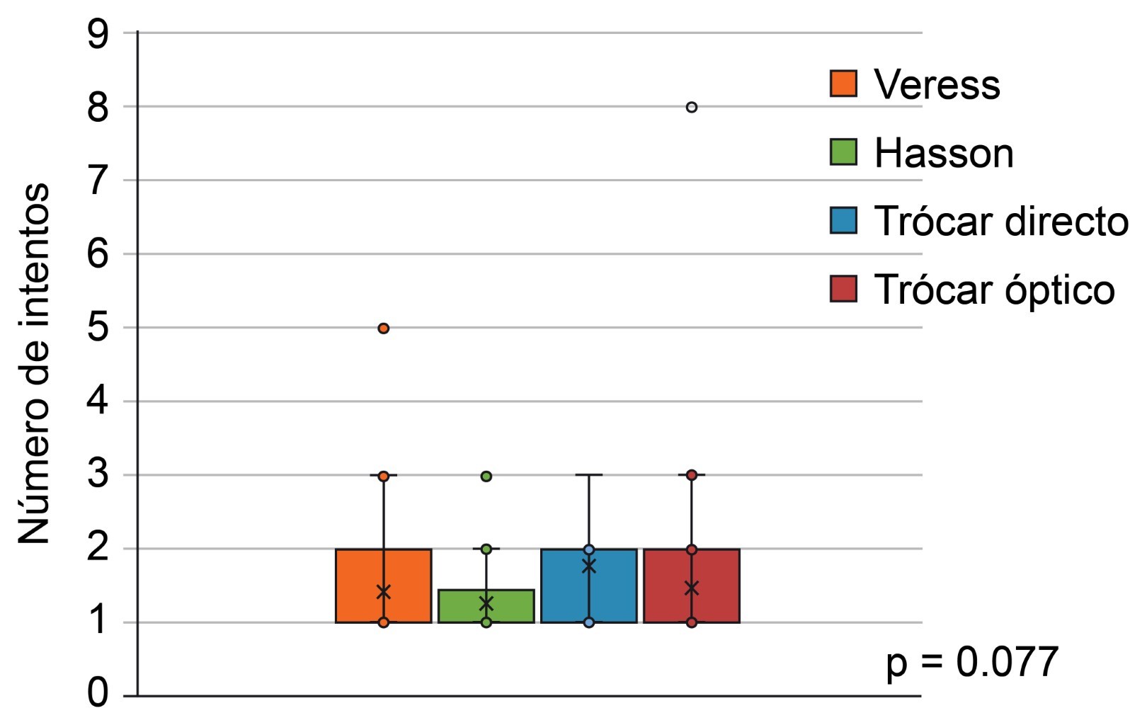 Material and methods: observational, prospective, four-arm cohort of women from the gynaecology and laparoscopic surgery department of the Hospital Angeles Pedregal. The number of attempts and time to achieve cavity access and the presence of complications were quantified.