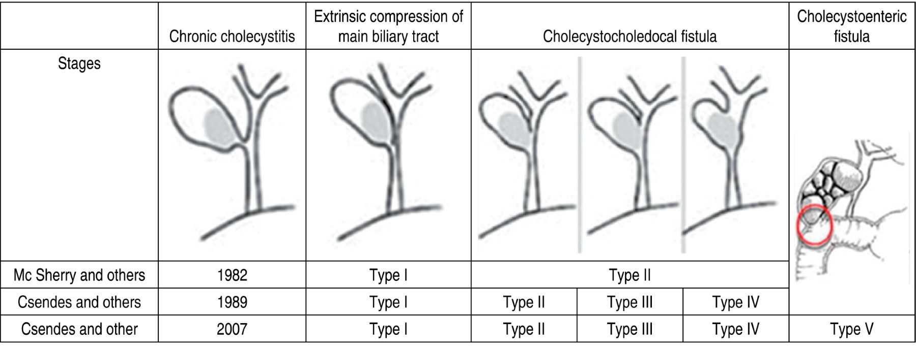 The different classifications of MS have been based on the findings reported, either by the presence or absence of fistulous erosion between the gallbladder, the main biliary tract, and the digestive tract. Thus Mc Sherry and collaborators4 in 1982 classified MS into two types; which, in turn, due to the more profound knowledge of this disease, were reclassified in 1989 by Csendes5 into four types, and later in 2008, Beltrán and Csendes added a type V that they subdivided into Va and Vb.6