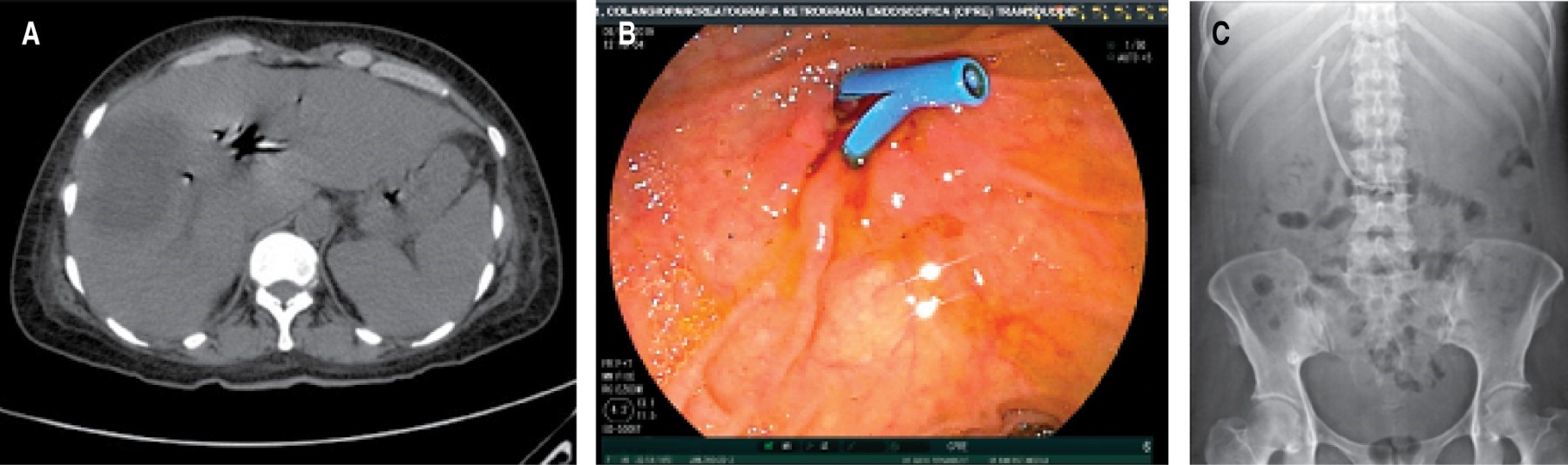 An abdominal CT scan was performed on 10/02/19, which reported findings of a hypodense image of 80 × 53 mm with 23 HU in segments VI and VII concerning liver abscess on the right side, hepatomegaly at the expense of the same lobe, presence of pneumobilia, which is observed in communication with the anterior wall of the gallbladder, little free fluid in the pelvic cavity, bilateral pleural effusion and passive atelectasis. Similarly, ERCP was requested on 10-09-19, which reported a common bile duct of 10 mm, a circular filling defect of approximately 20 mm, which delays emptying the contrast medium from the biliary tract, reporting probable Mirizzi syndrome type IV, and bilioenteric fistula of a site to be determined. Sphincterotomy is performed, sweeping with a lithotripsy cannula and placing a 10 × 10 cm Amsterdam-type stent (Figure 2).